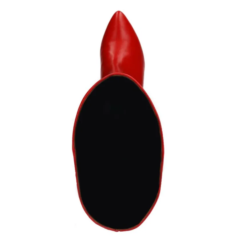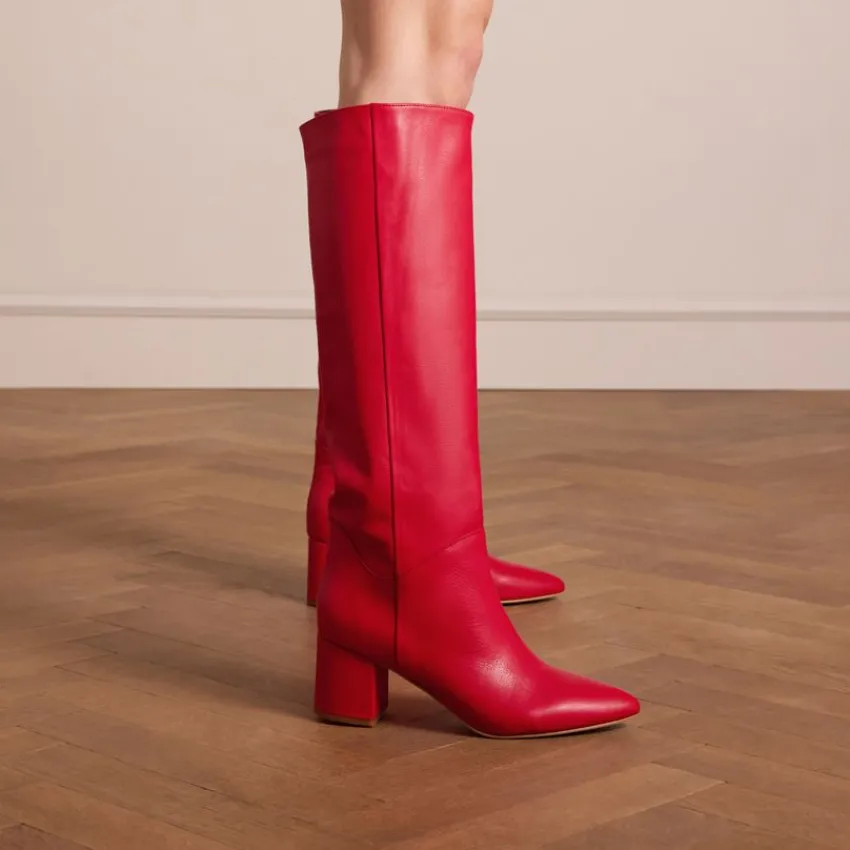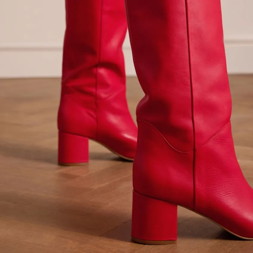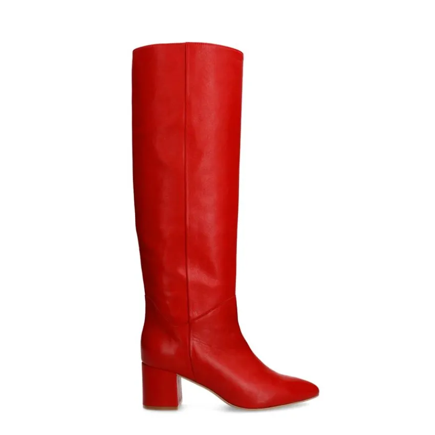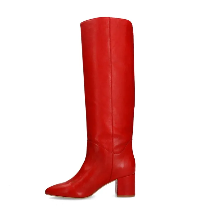 Rode hoge leren laarzen met hak van Manfield. De laarzen hebben een puntige neus en blokhak van 6 cm. De schachthoogte is 42 cm en de schachtbreedte is 37 cm, gemeten bij een maat 37. We adviseren als verzorging en bescherming de Collonil Carbon Pro.