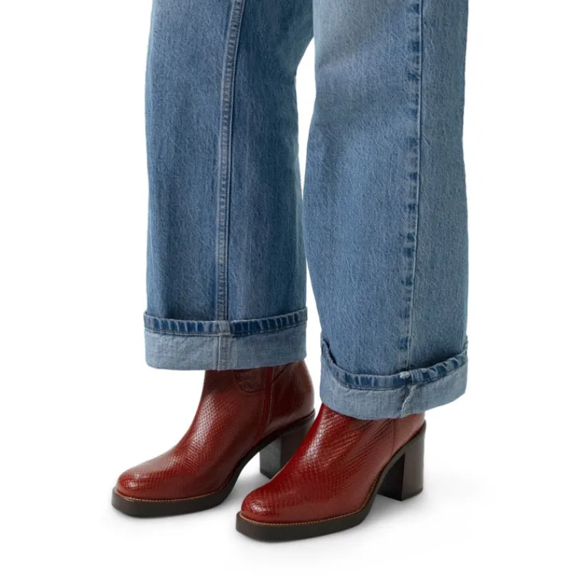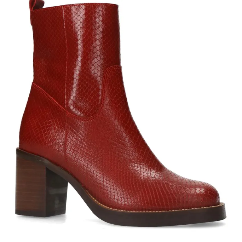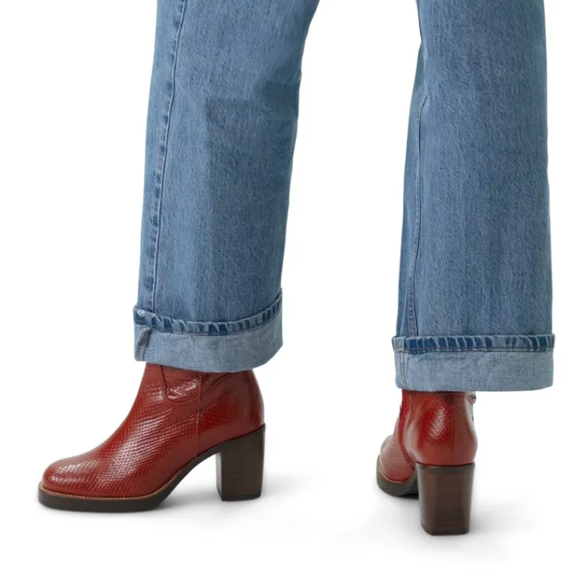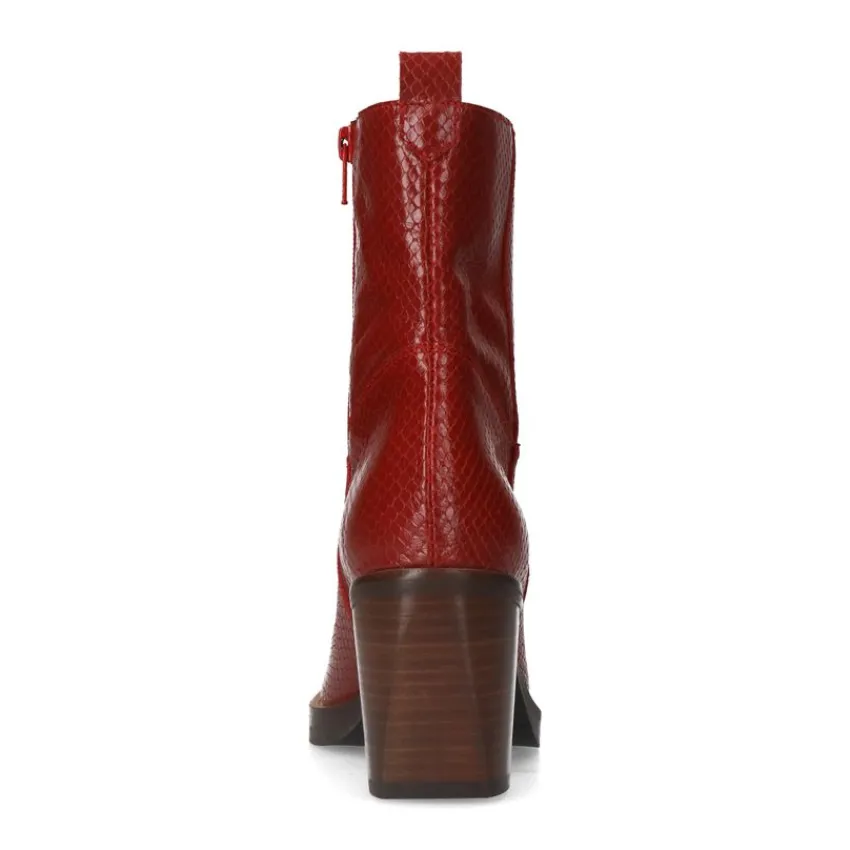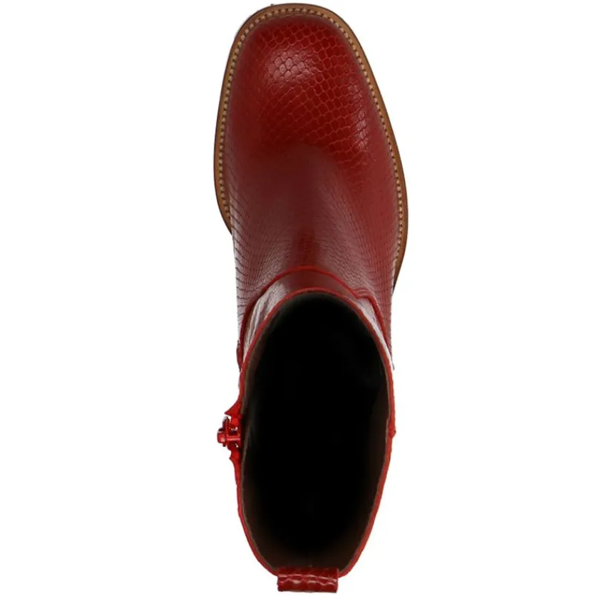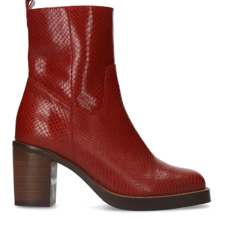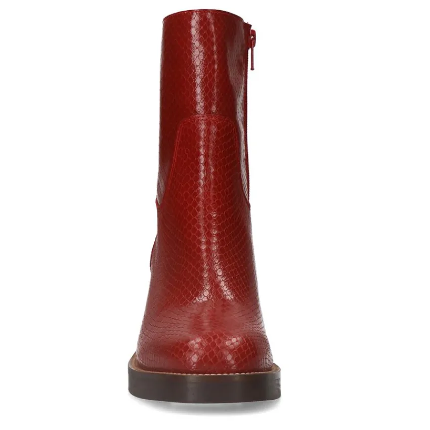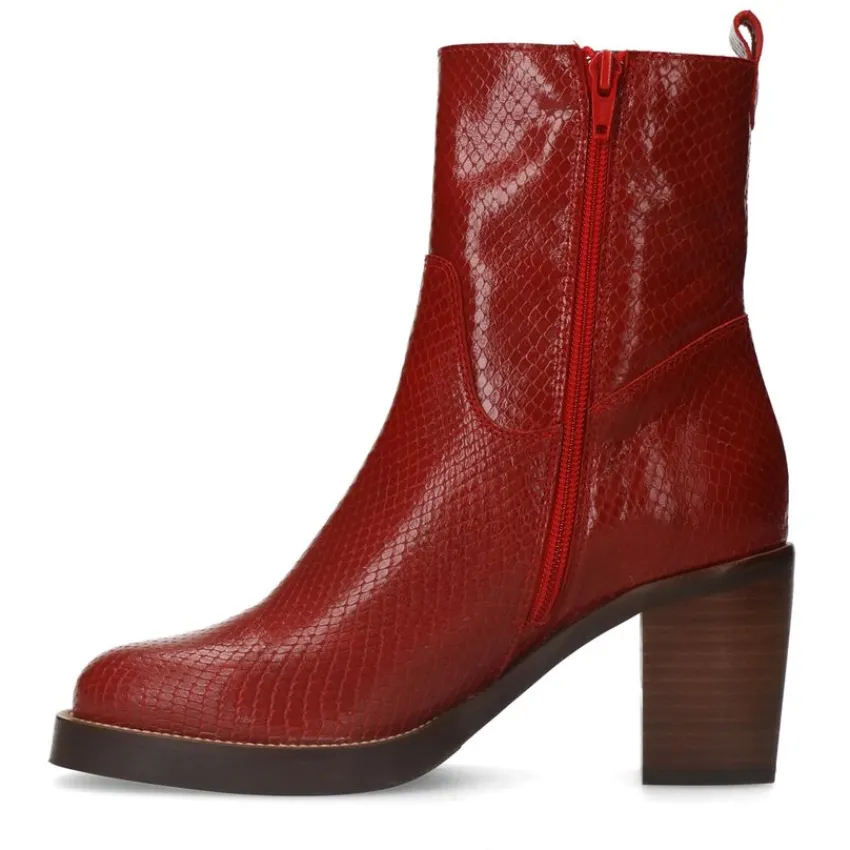 Rode leren enkellaarsjes met hak van Manfield. De laarsjes hebben een blokhak van 7,5 cm, ritssluiting aan de binnenzijde en een ronde neus. We adviseren als verzorging en bescherming de Collonil Carbon Pro.