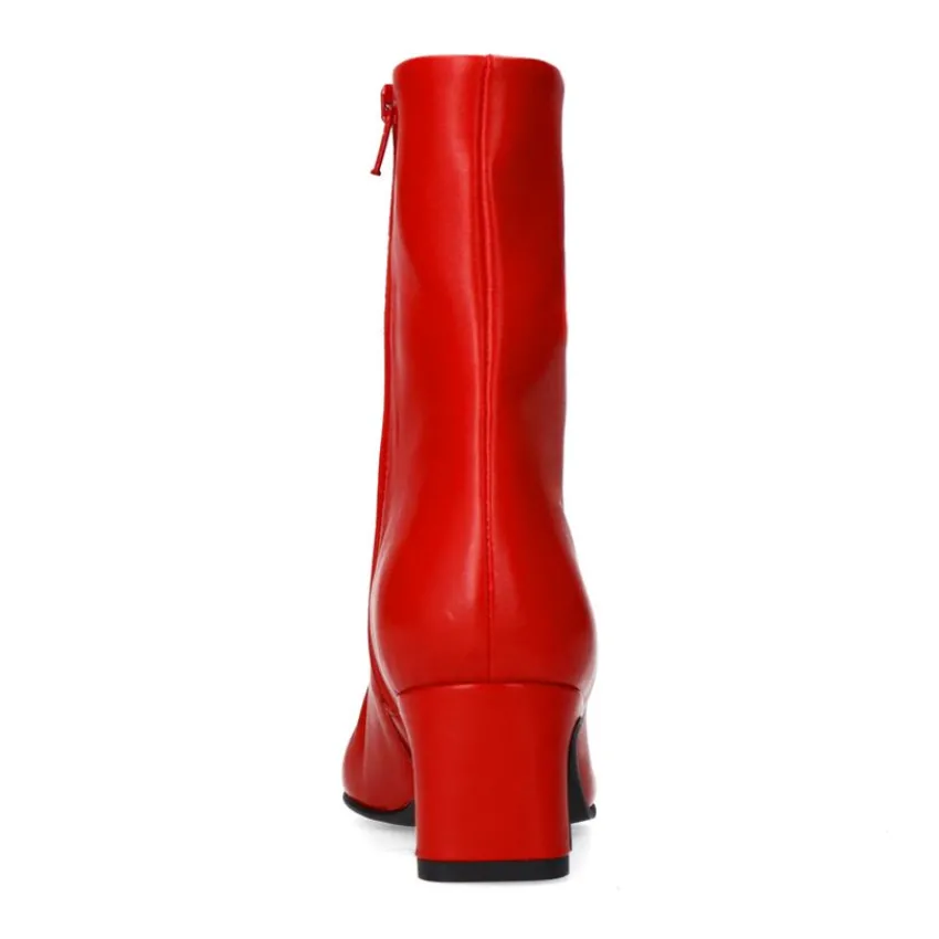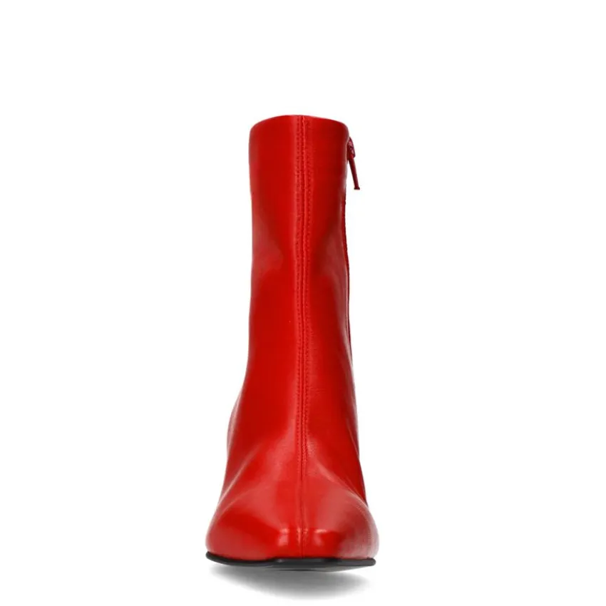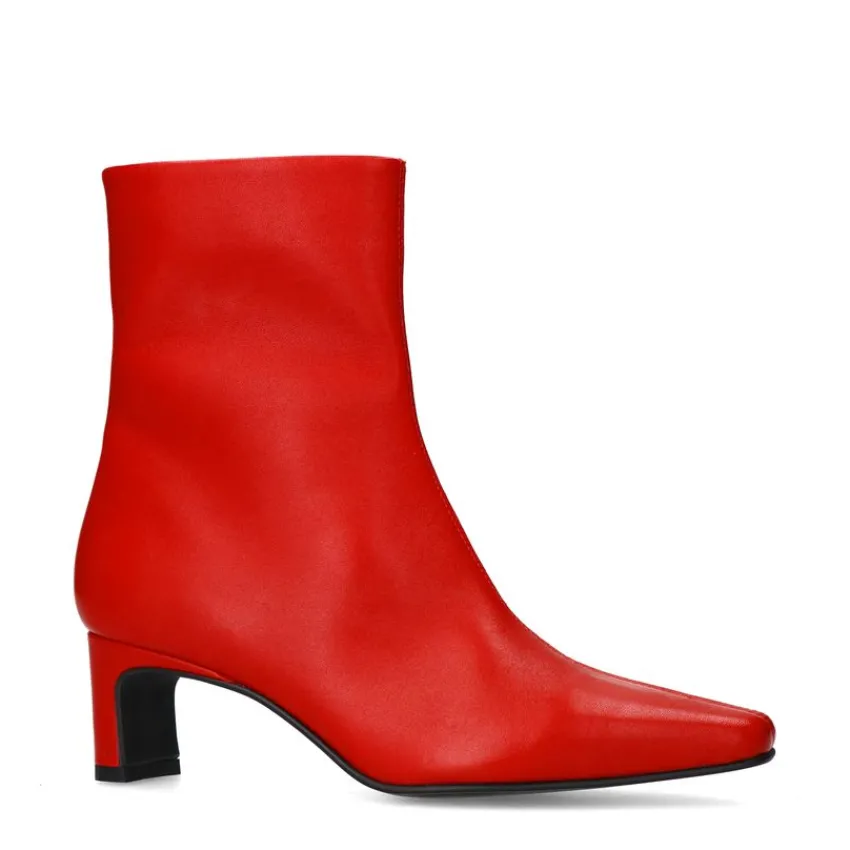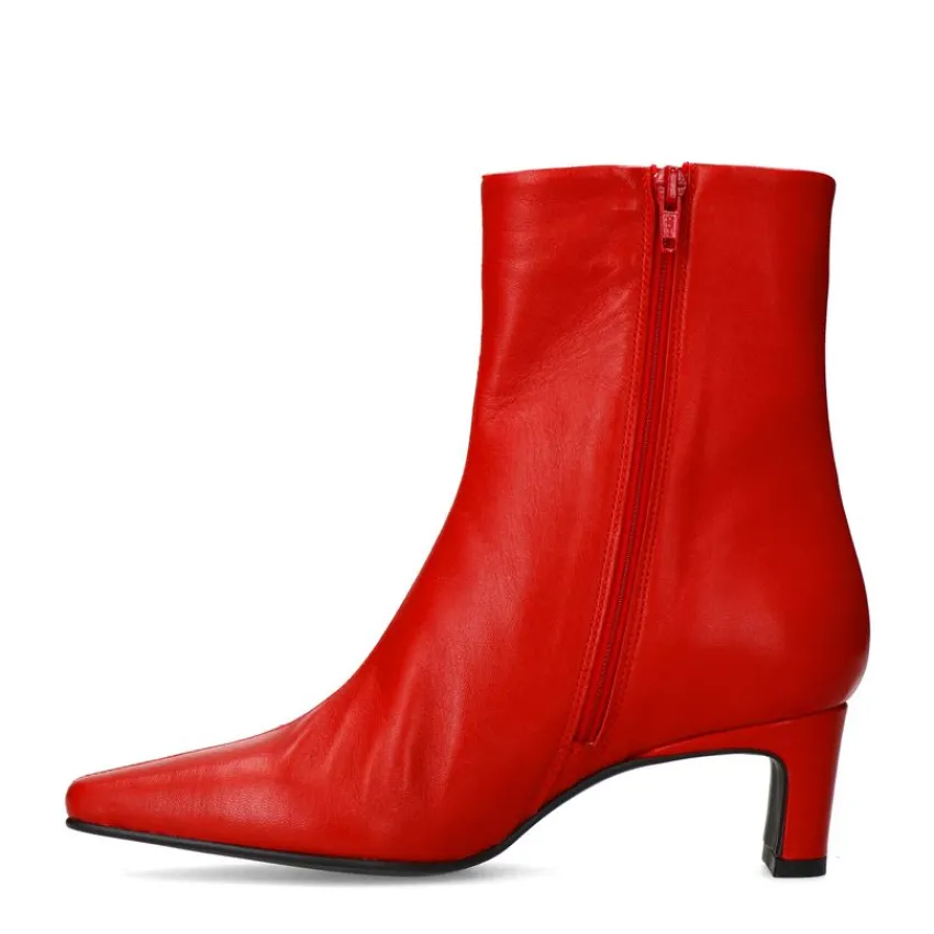 Rode leren enkellaarsjes met hak van Manfield. De laarsjes hebben een lage hak van 5 cm, puntige neus en ritssluiting aan de binnenzijde. We adviseren als verzorging en bescherming de Collonil Carbon Pro.