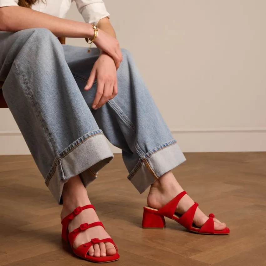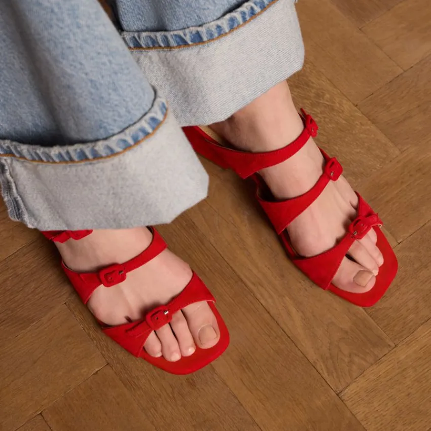 Rode suède sandalen met hak en gespjes van Manfield. De sandalen hebben een blokhak van 5 cm. We adviseren als verzorging en bescherming de suède/nubuck spray in transparant.