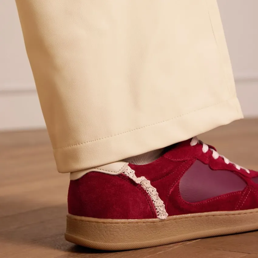 Rode suède sneakers van Manfield met witte vetersluiting, mesh details aan de zijkant en bruine zool van 2 cm. We adviseren als verzorging en bescherming de suède/nubuck spray in transparant.