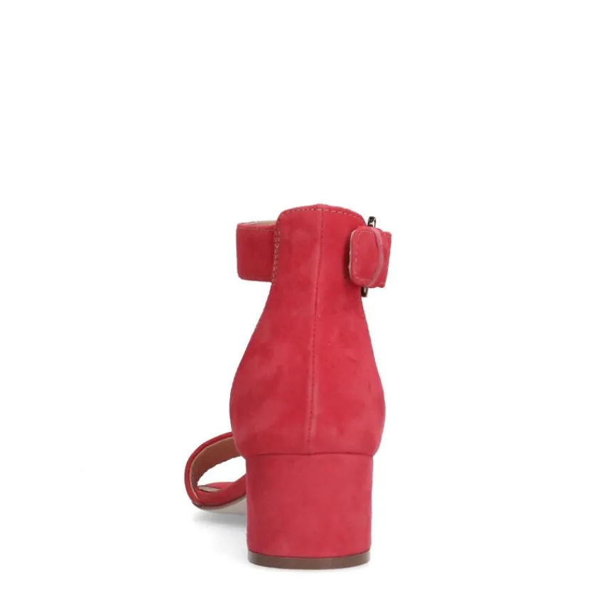 Roze suède sandalen met hak van Manfield. De sandalen hebben een lage hak van 4 cm en gespsluiting rondom de enkel. We adviseren als verzorging en bescherming suède/nubuck spray in transparant.