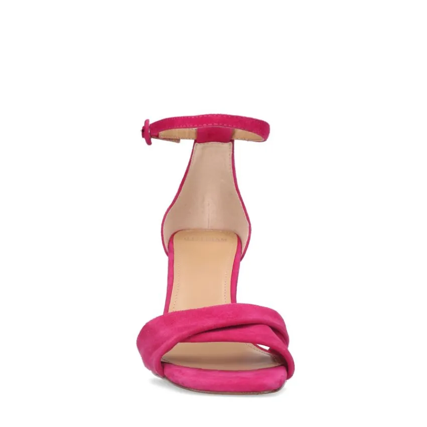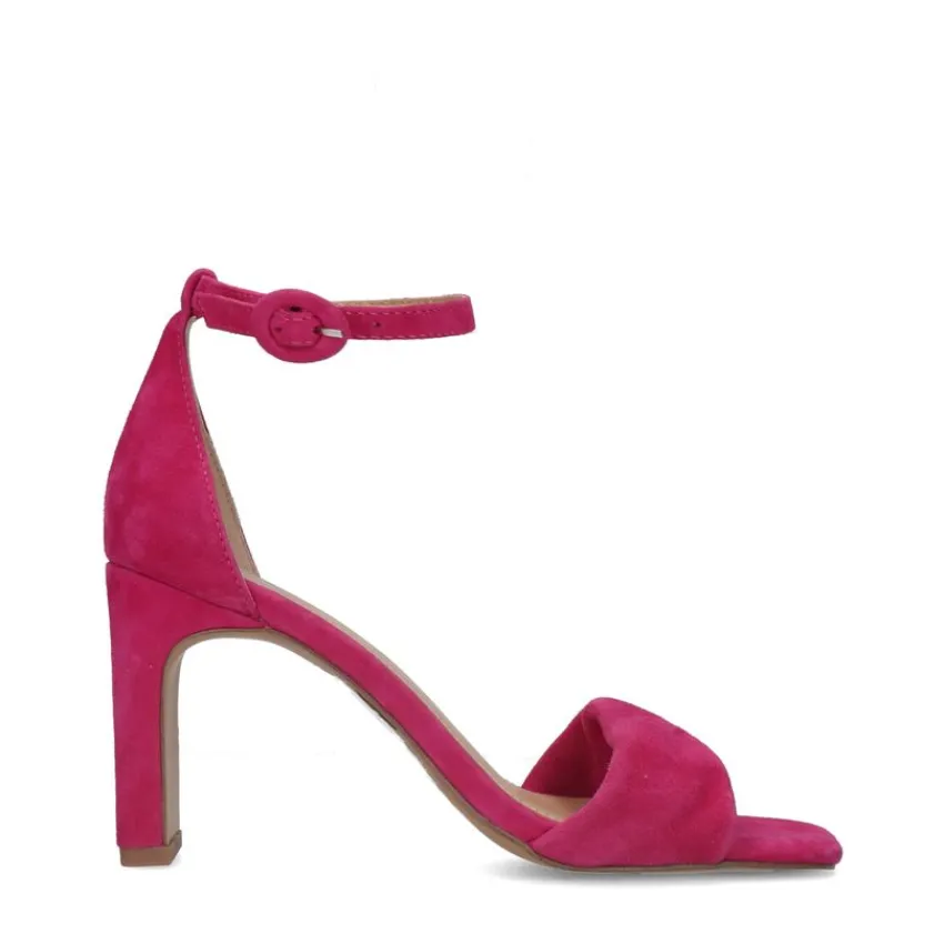 Roze suède sandalen met hak van Manfield. De sandalen hebben een gespsluiting rondom de enkel en hakhoogte van 8 cm. We adviseren als verzorging en bescherming de suède/nubuck spray in transparant.