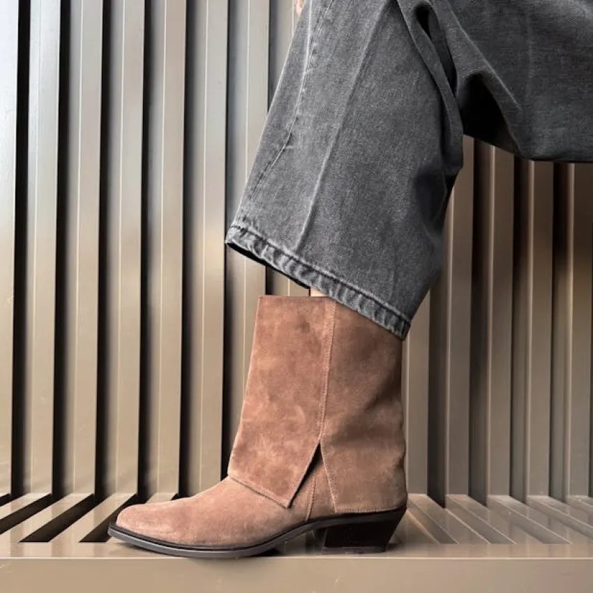 Taupe suède cowboy laarzen met flap van Manfield en schuin afgesneden blokhak van 5 cm. We adviseren als verzorging en bescherming de Collonil Carbon Pro 300ml.