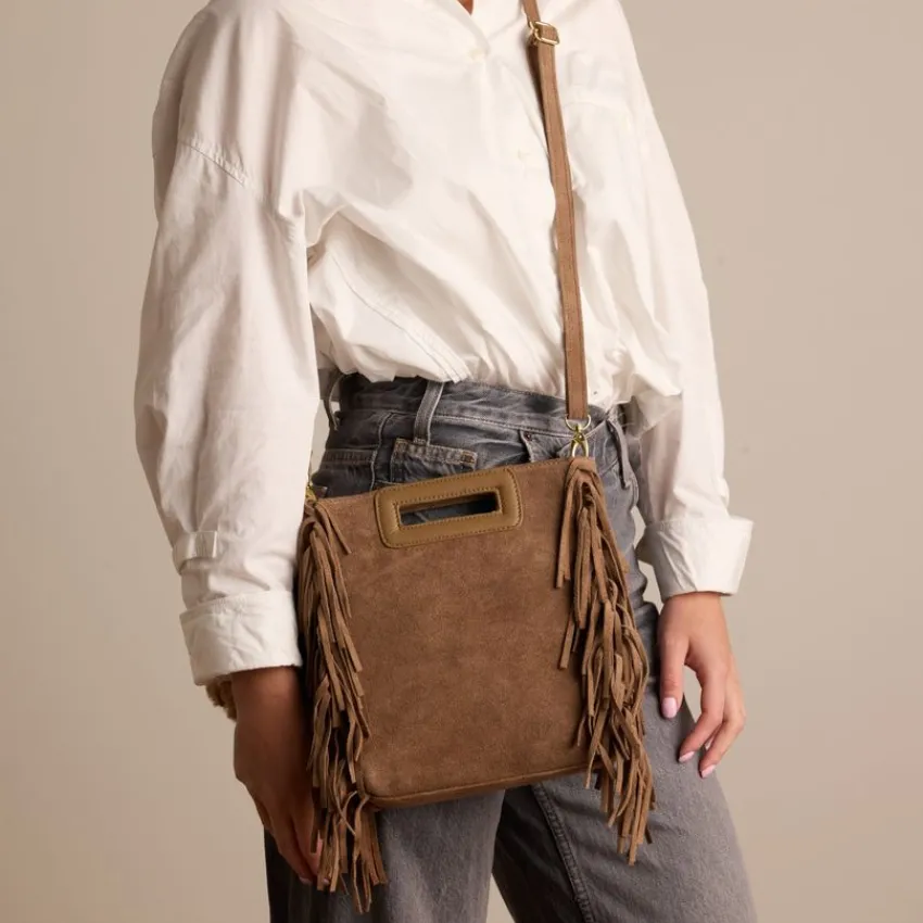 Taupe suède handtas met franjes van Manfield. De tas heeft een afmeting van 21x25x6 cm (BxHxD) en een verstelbare band.