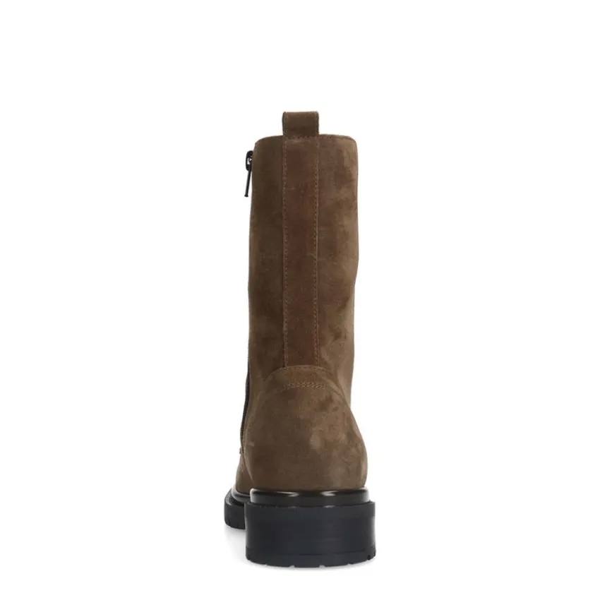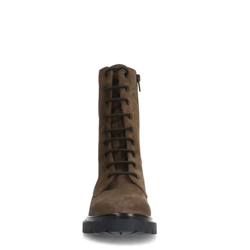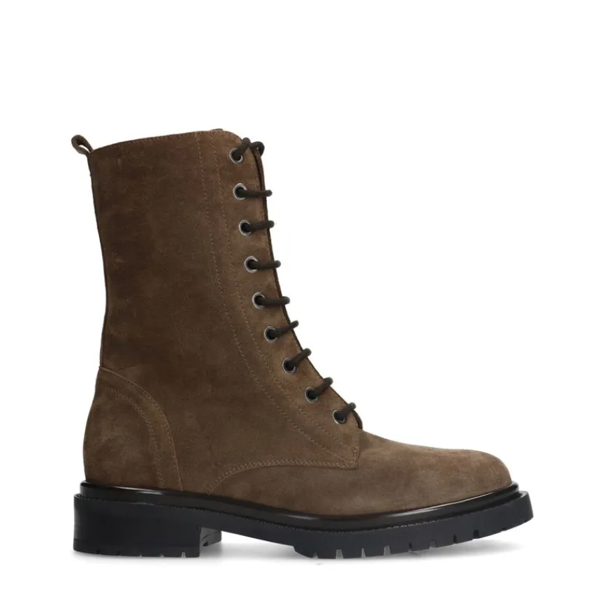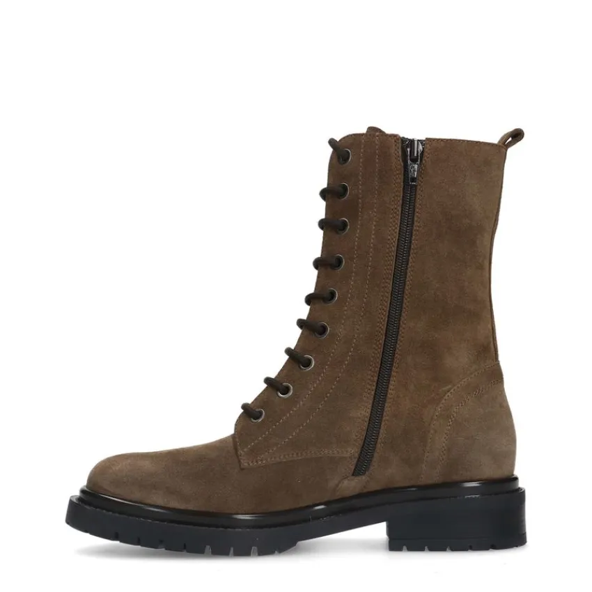 Taupe suède veterlaarsjes van Manfield met een ritssluiting aan de binnenzijde en een platte hak van 2 cm. We adviseren als verzorging en bescherming de suède/nubuck spray in transparant.