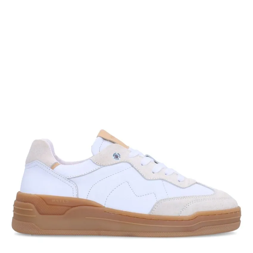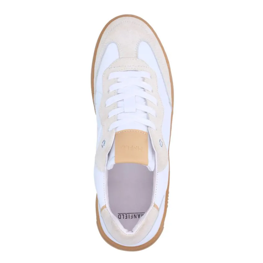 Witte leren sneakers met beige suéde details van Manfield met bruine plateau zool van 4 cm, we adviseren als verzorging en bescherming de Collonil Carbon Pro spray.
