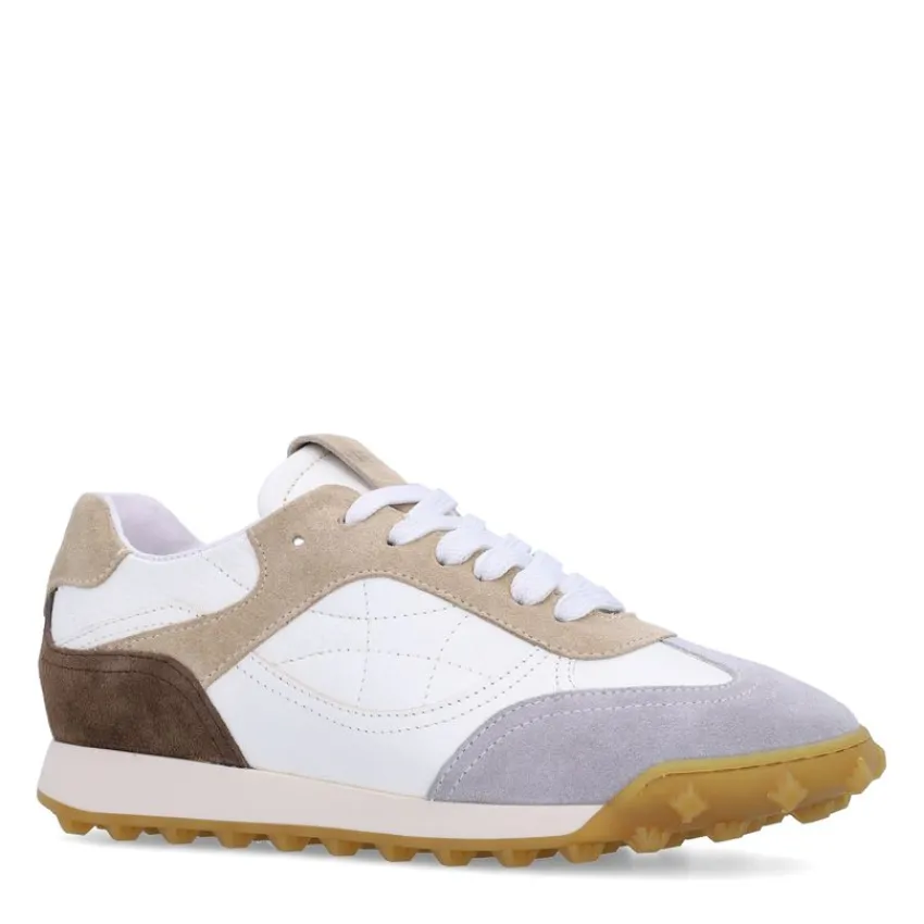 Witte leren sneakers met taupe suède details van Manfield. De sneakers hebben een witte zool van 3 cm. We adviseren als verzorging en bescherming de Collonil Carbon pro.