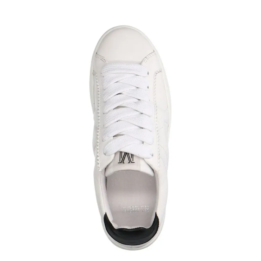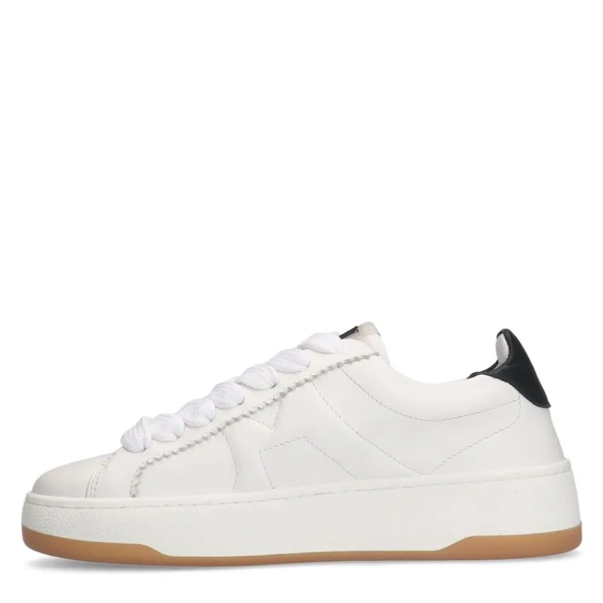 Witte leren sneakers van Manfield met witte zool van 2 cm en uitneembare binnenzool. We adviseren als verzorging en bescherming de Collonil Carbon Pro.