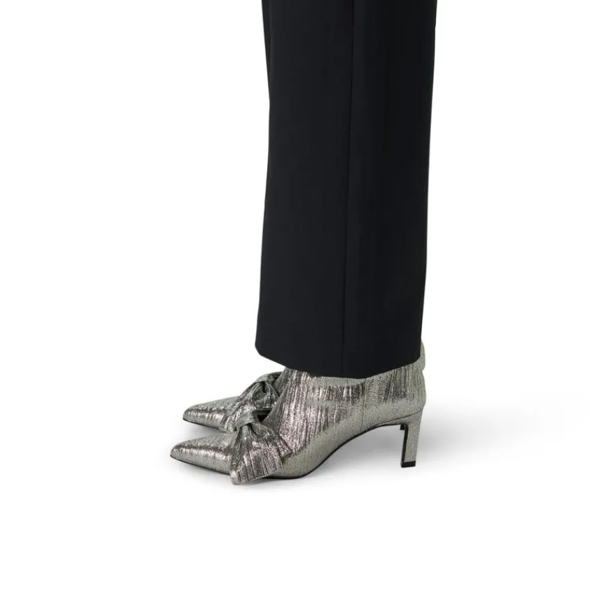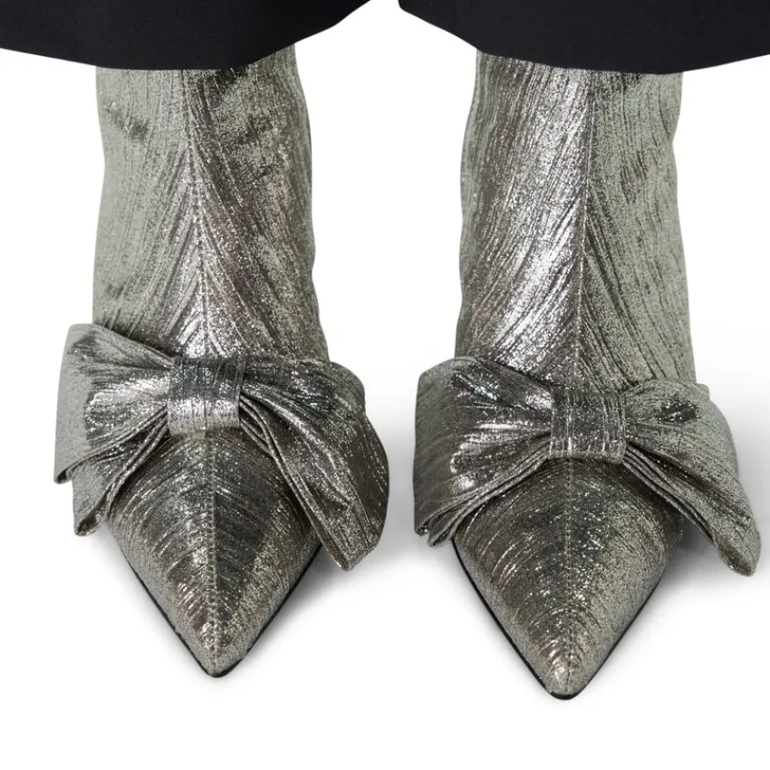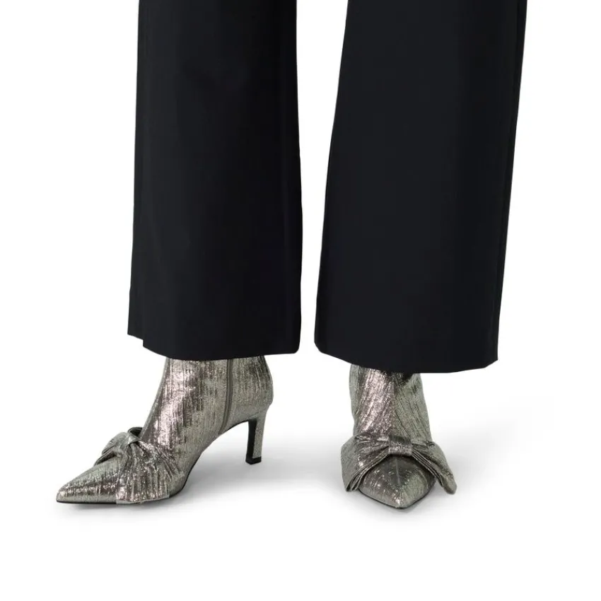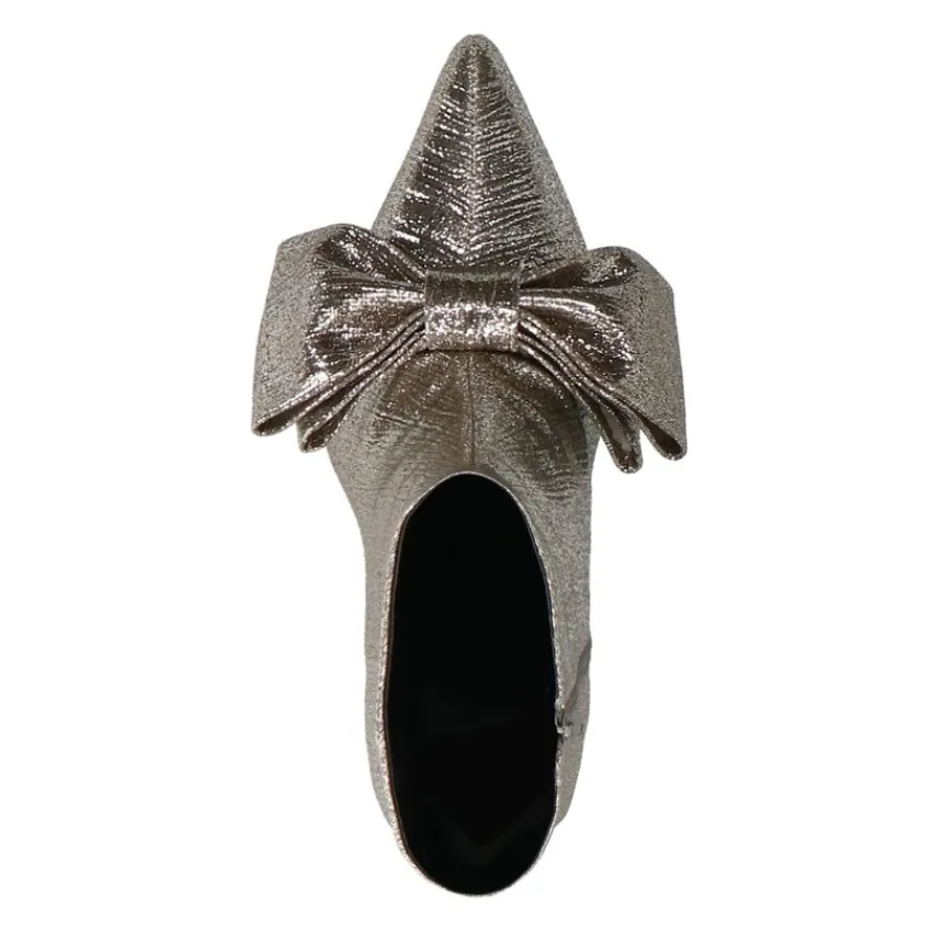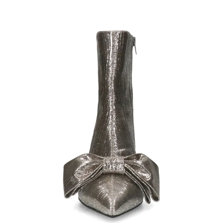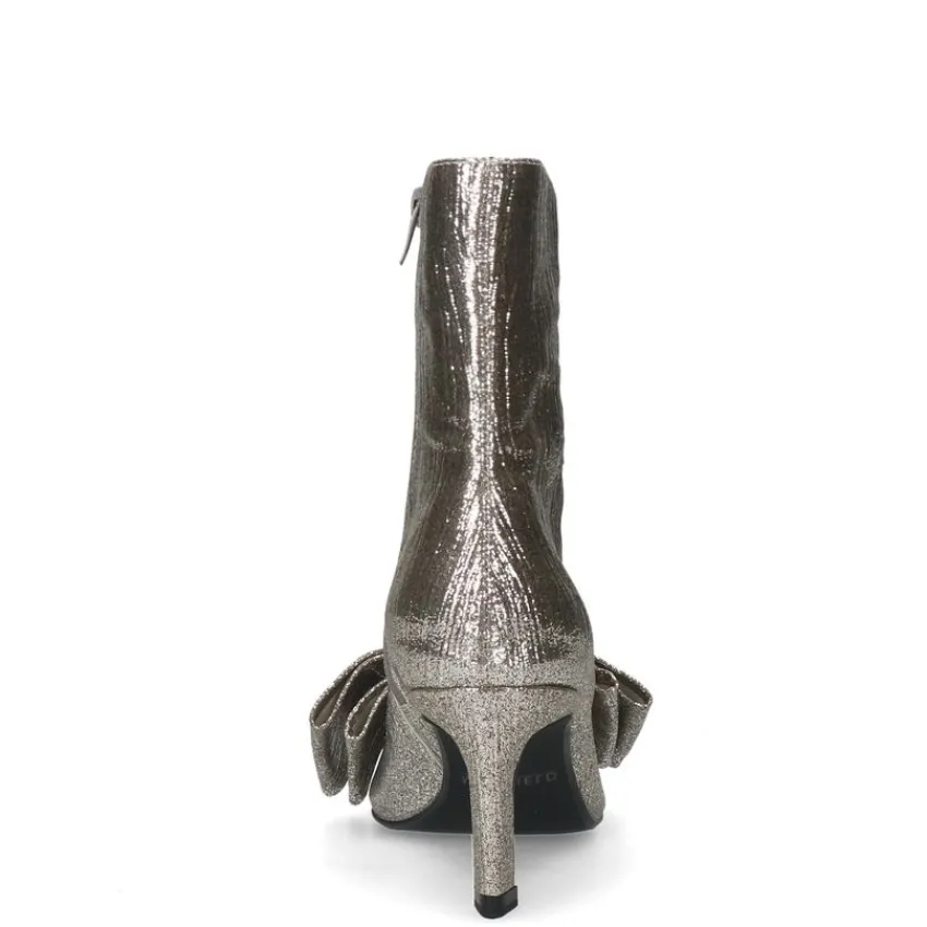 Zilveren glitter enkellaarsjes met hak van Manfield. De laarsjes hebben een puntneus, strik op de voorvoet, ritssluiting aan de binnenzijde en hak van 6 cm. We adviseren als verzorging en bescherming de Natural Trendspray.