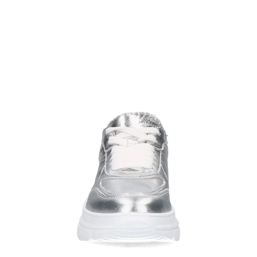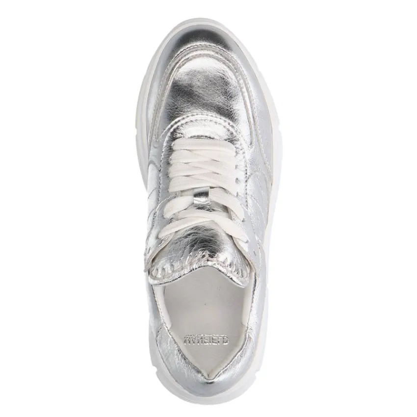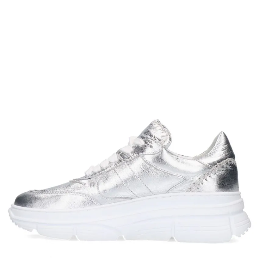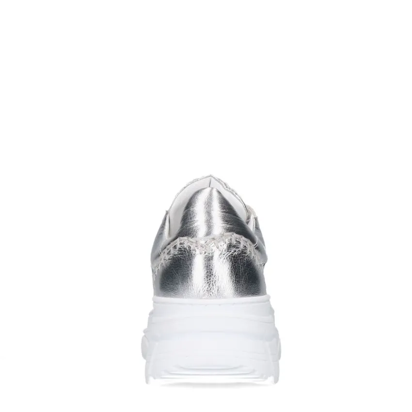 Zilveren leren sneakers van Manfield en hebben een witte zool van 3 cm. We adviseren als verzorging en bescherming de Collonil Metallic spray.
