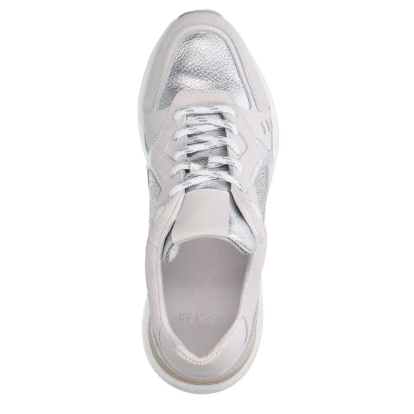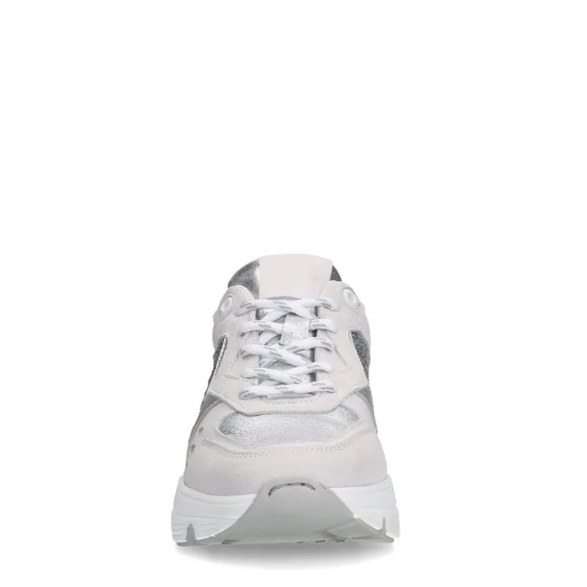 Zilveren leren sneakers van het merk Manfield. De zool heeft een hoogte van 4 cm. De schoen heeft zilveren metallic en glitter details. Stijl de sneakers onder een jeans en maak je look een stukje eleganter.