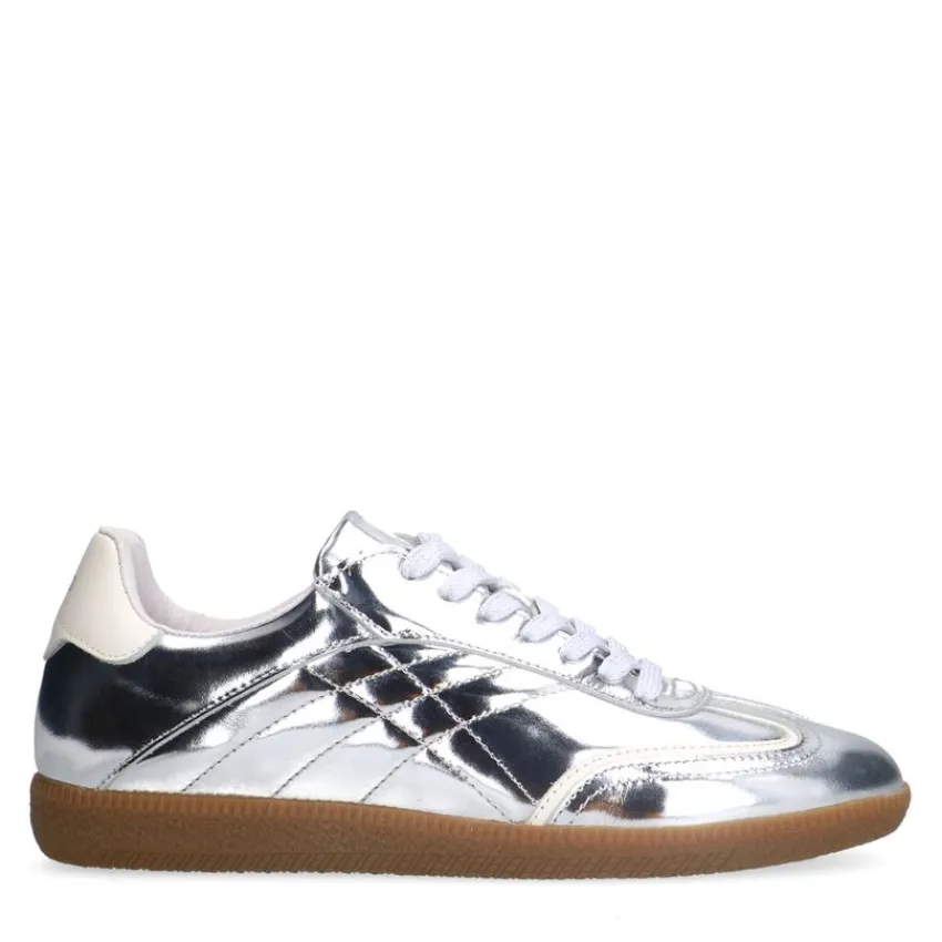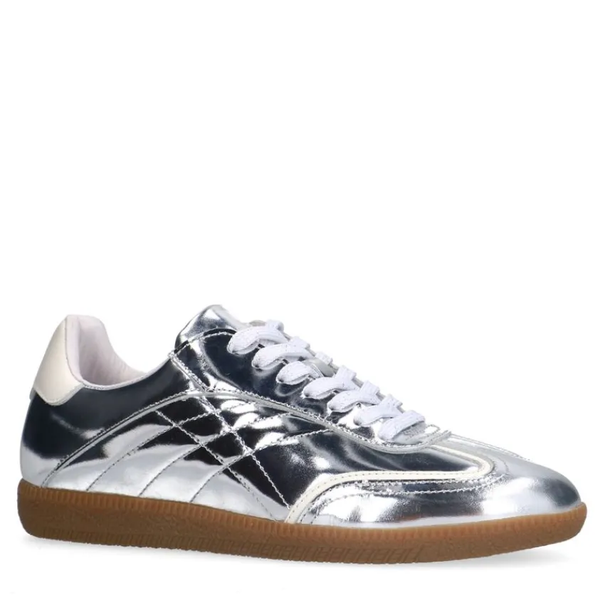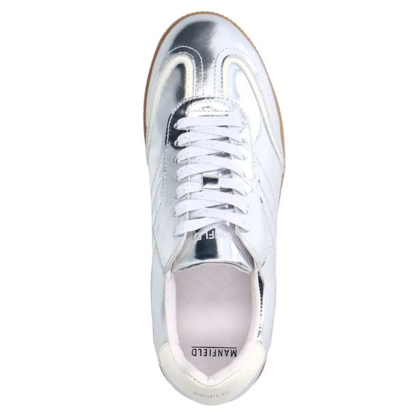 Zilveren leren sneakers van Manfield met bruine zool van 2 cm en een uitneembare binnenzool. We adviseren als verzorging en bescherming de Collonil Carbon Pro.