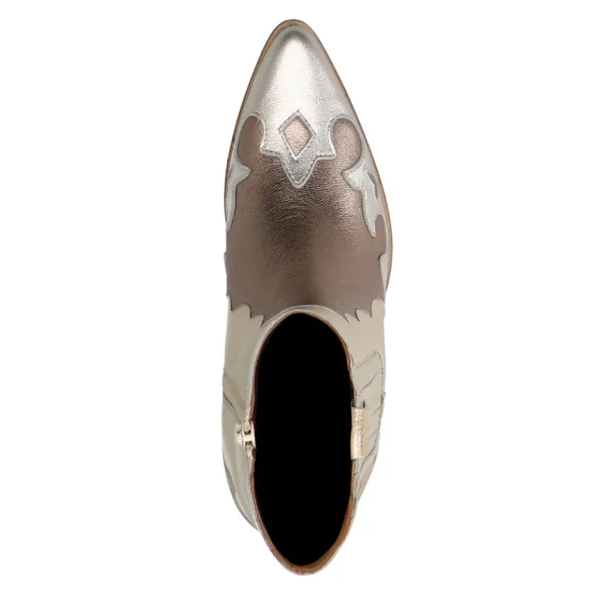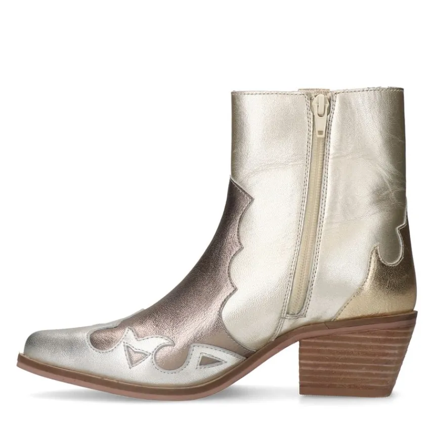 Zilveren metallic leren cowboy laarzen van Manfield met een schuin afgesneden blokhak van 5 cm en een puntige neus. De laarzen hebben een uniek design en ritssluiting aan de binnenzijde. We adviseren als verzorging en bescherming de Collonil Metallic spray.
