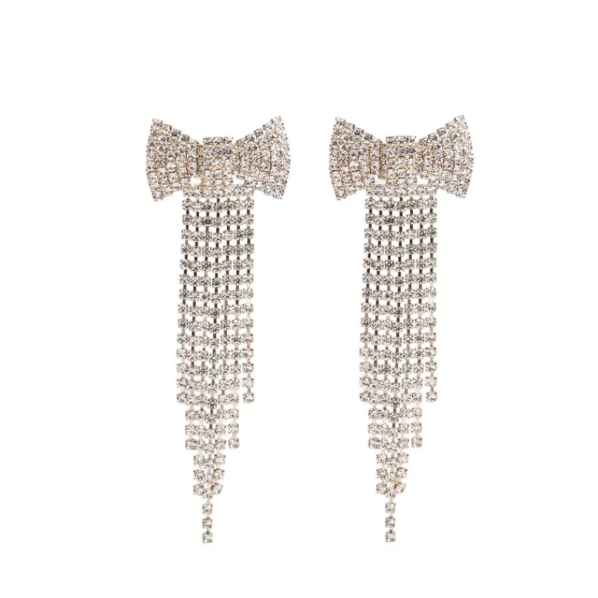 Zilveren strass party oorbellen met strikjes van Manfield. De oorbellen zijn 8,5 cm lang en wegens de algemene hygiënevoorschriften kan dit artikel niet geretourneerd worden.