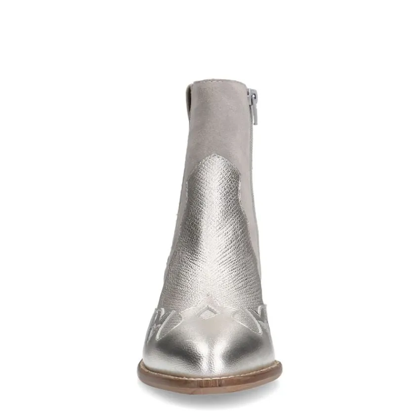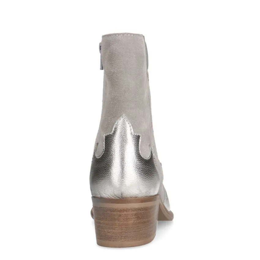 Zilveren suède metallic cowboy laarzen van Manfield, met een blokhak van 4 cm. De laarsjes hebben een puntige neus en een ritssluiting aan de binnenzijde. We adviseren als verzorging en bescherming de Collonil Carbon Pro of de suède/nubuck spray in transparant.