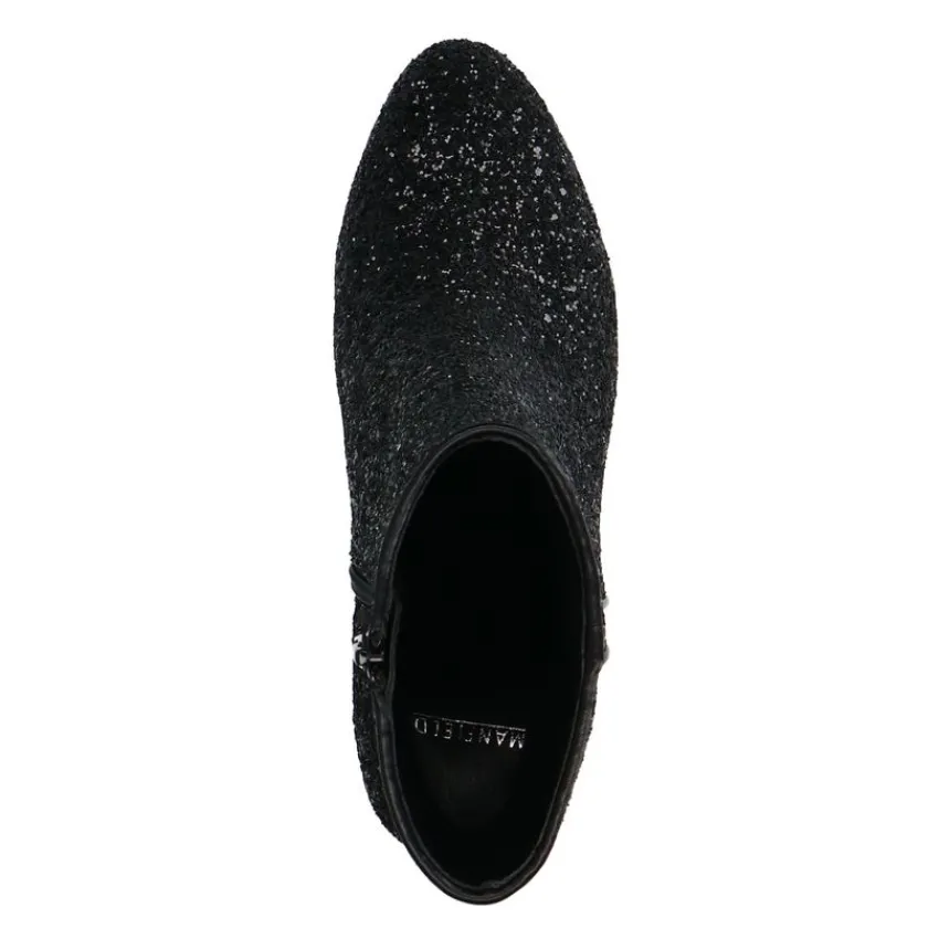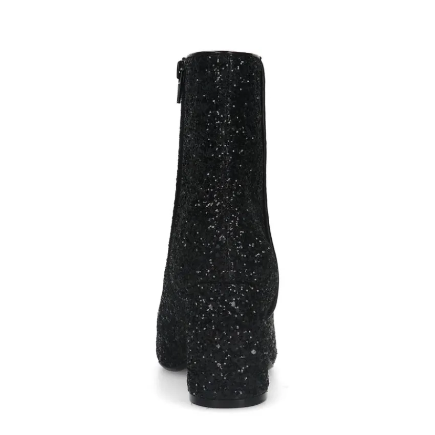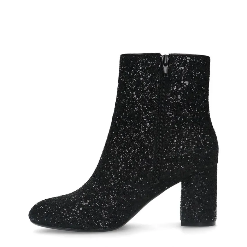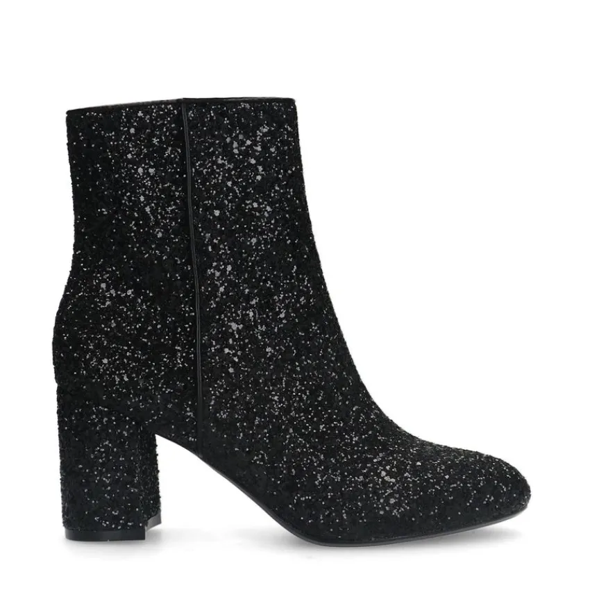 Zwarte glitter enkellaarsjes met hak van Manfield. Deze enkellaarsjes met hak zijn een échte eyecatcher welke ideaal te dragen zijn tijdens een feestje! Deze enkellaarsjes zijn voorzien van zilverkleurige glitters en hebben een blokhak met hoogte van 7 cm. Deze dames laarsjes kunnen gesloten worden door middel van een ritssluiting.