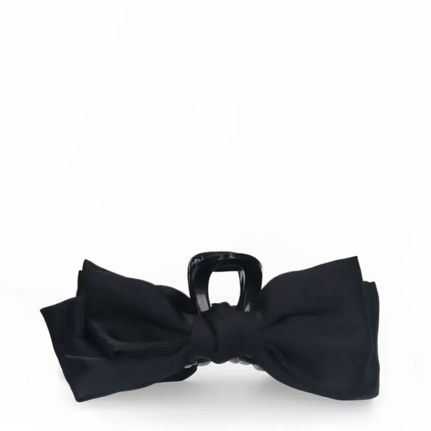 Zwarte haarklem met strik van Manfield. De klem is 11 cm breed en de strik is 14 cm breed.