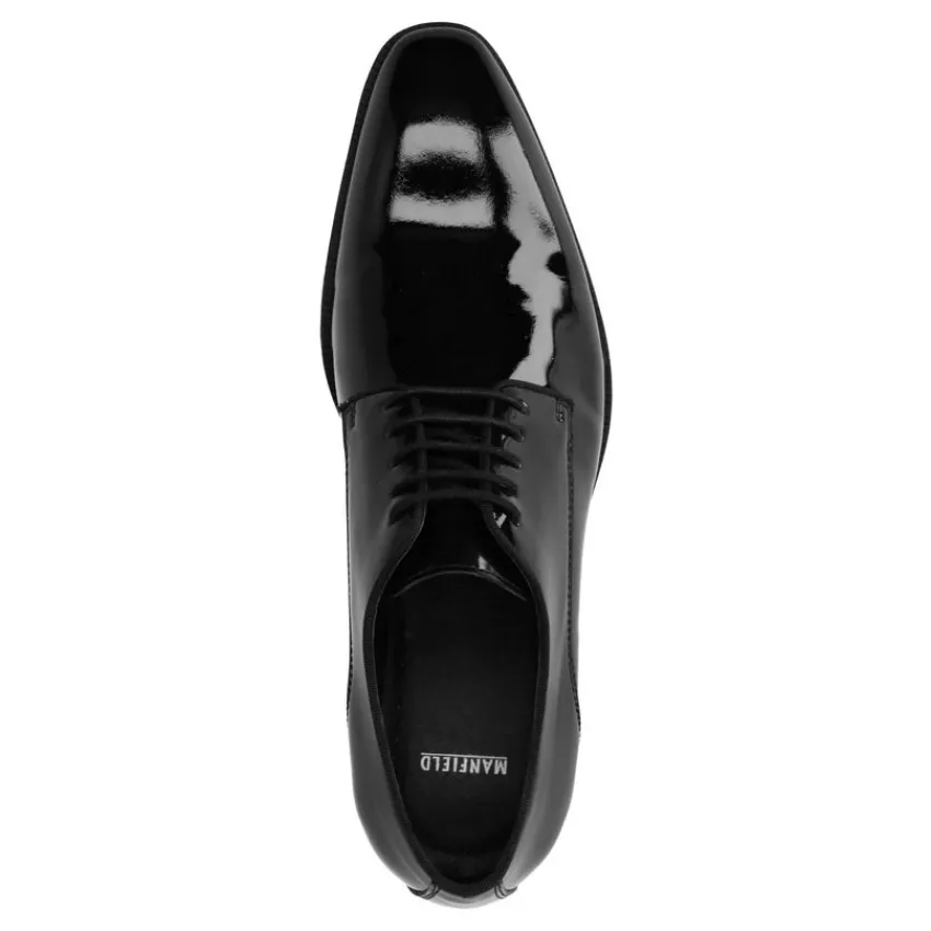 Veterschoenen zijn klassiekers voor iedere man. Deze zwarte variant is van het merk Manfield. Opvallend aan dit paar is de lak finish. Draag de veterschoenen onder een pantalon voor een zakelijke look. De binnen- en buitenkant zijn van leer. Maak daarom gebruik van de juiste verzorgingsproducten. Let op: spuit je schoenen in met een onderhoudsproduct speciaal voor lakleren schoenen. Herhaal dit vervolgens maandelijks om je schoenen in perfecte conditie te houden.