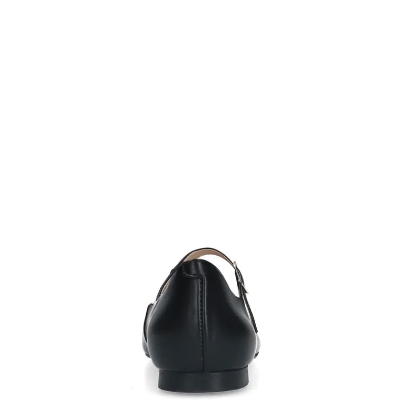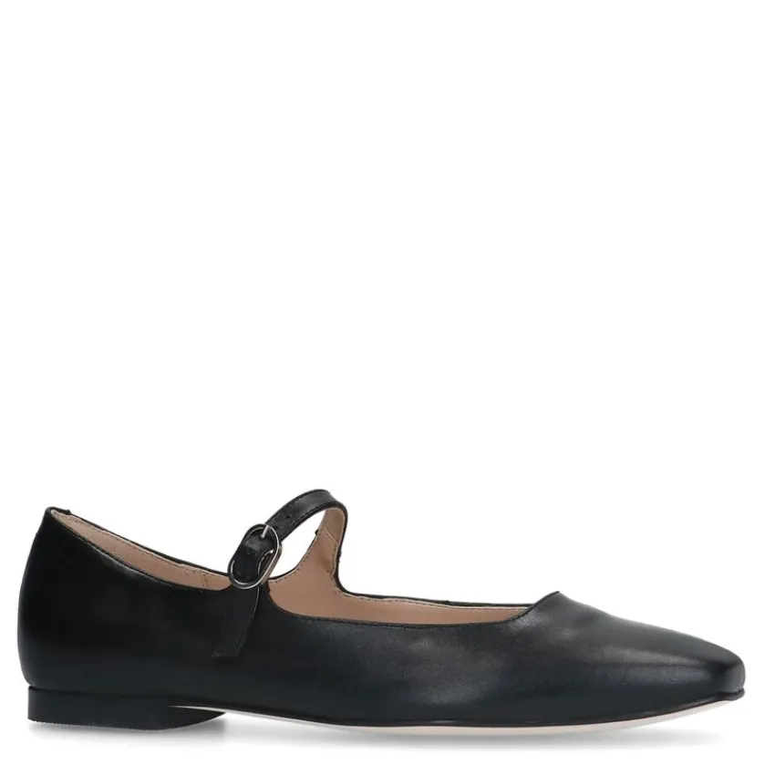 Zwarte leren ballerina’s van Manfield met een gespsluiting en platte hak van 1 cm. We adviseren als verzorging en bescherming de Collonil Carbon Pro.