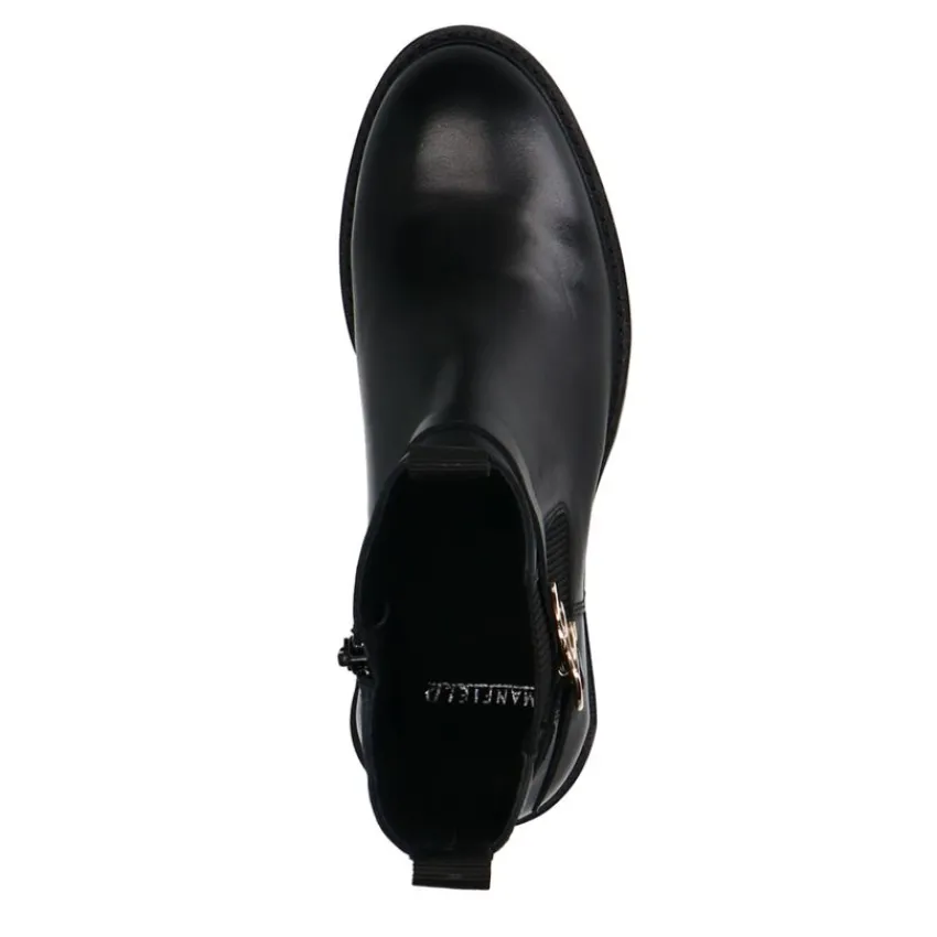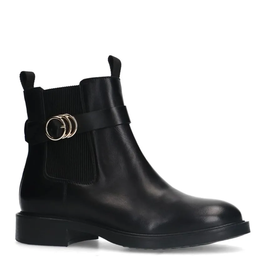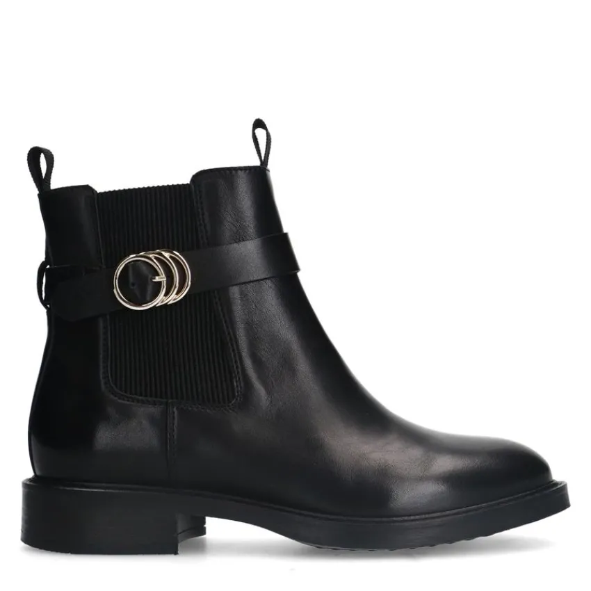 Zwarte leren chelsea boots met gesp van Manfield met een ritssluiting aan de binnenzijde en een platte hak van 2 cm. We adviseren als verzorging en bescherming de Collonil Carbon Pro.