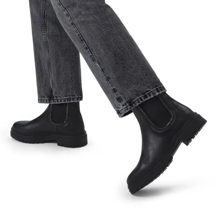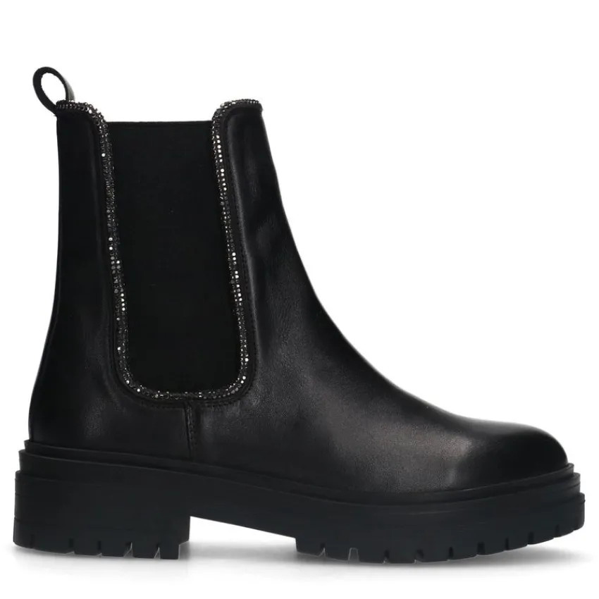 Zwarte leren chelsea boots van Manfield met glitter details. De boots hebben een platte hak van 4 cm, plateauzool van 2,5 cm en elastieken sluiting. We adviseren als verzorging en bescherming de Collonil Carbon Pro.
