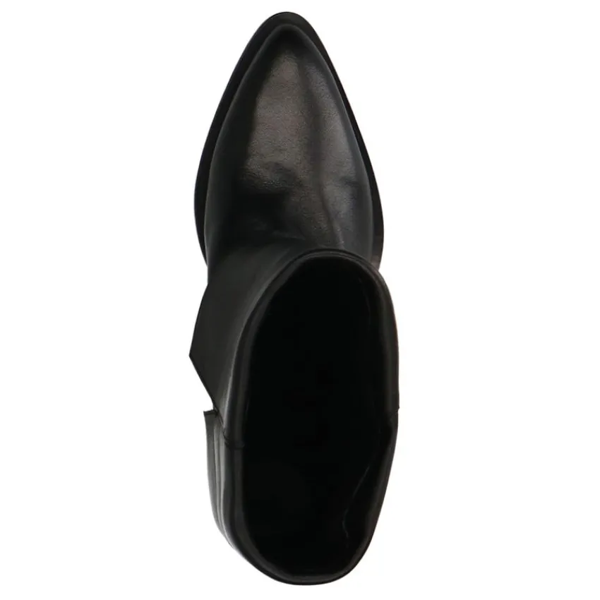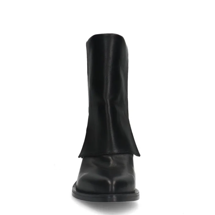 Zwarte leren cowboy laarzen met flap van Manfield en schuin afgesneden blokhak van 5 cm. We adviseren als verzorging en bescherming de Collonil Carbon Pro 300ml.
