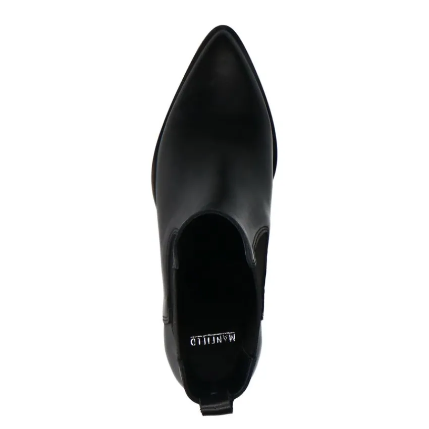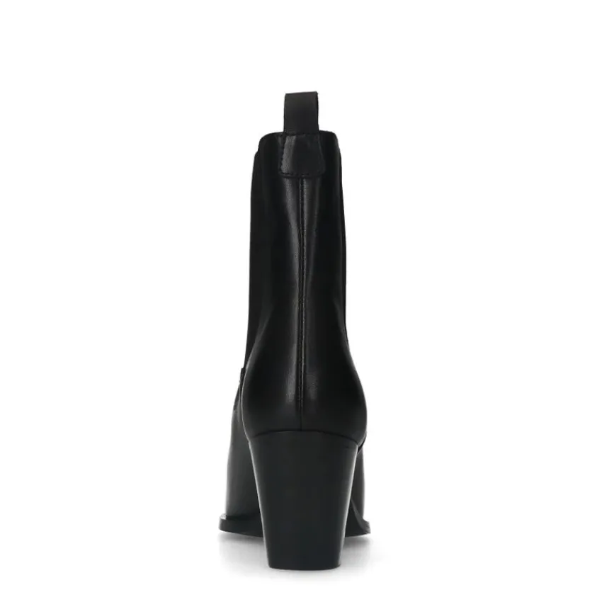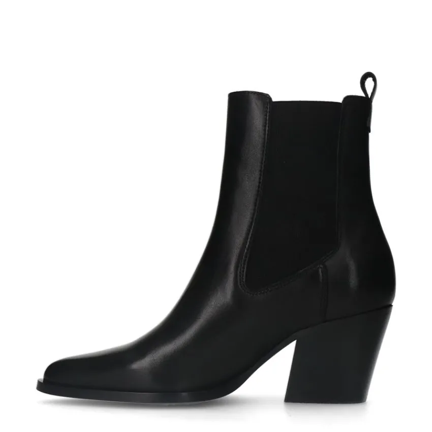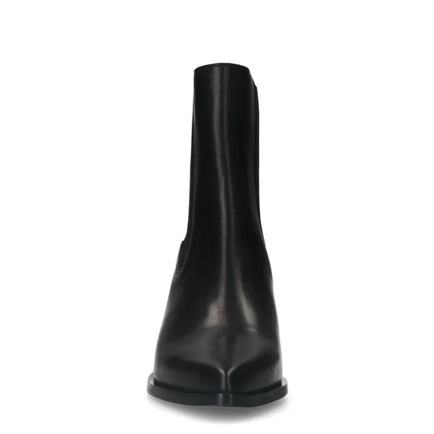 Zwarte leren cowboy laarzen van Manfield met een schuin afgesneden blokhak van 7 cm hoog en een puntneus. We adviseren als verzorging en bescherming de Collonil Carbon Pro.