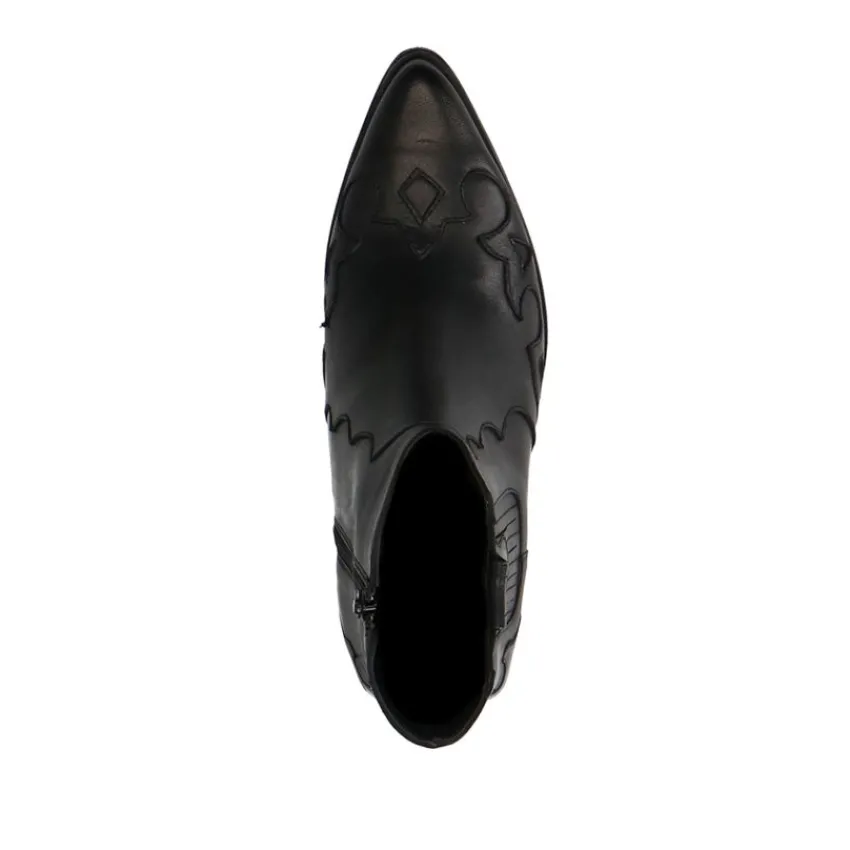 Zwarte leren cowboy laarzen van Manfield met schuin afgesneden hak van 5 cm en puntige neus. We adviseren als verzorging en bescherming de Collonil Carbon Pro.