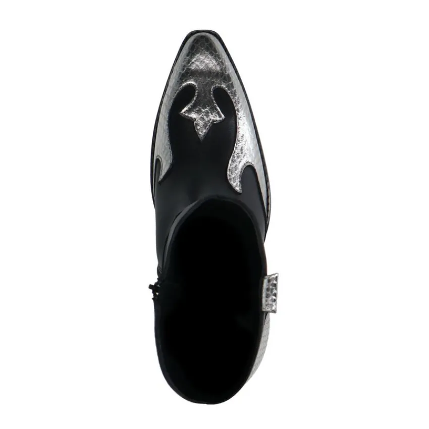 Zwarte leren cowboylaarzen met zilverkleurige metallic details van Manfield. Deze western boots zijn gemaakt van leer en daarom raden we je aan deze cowboy laarzen voor dames te verzorgen en beschermen met de Collonil Carbon Pro. Deze western laarzen zjin voorzien van een schuin afgesneden blokhak met hoogte van 7 cm. Deze dames laarzen kunnen gesloten worden door middel van een rits.