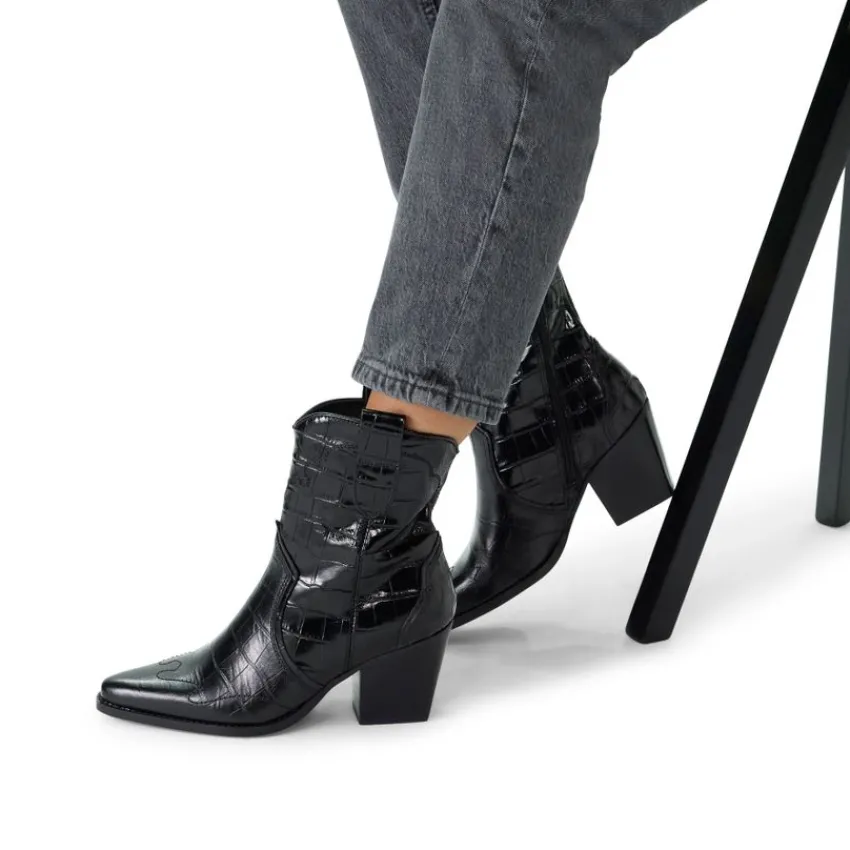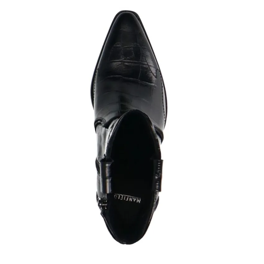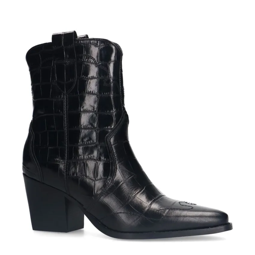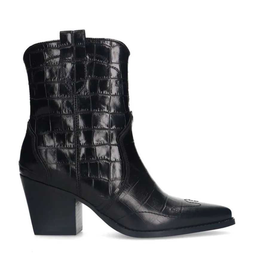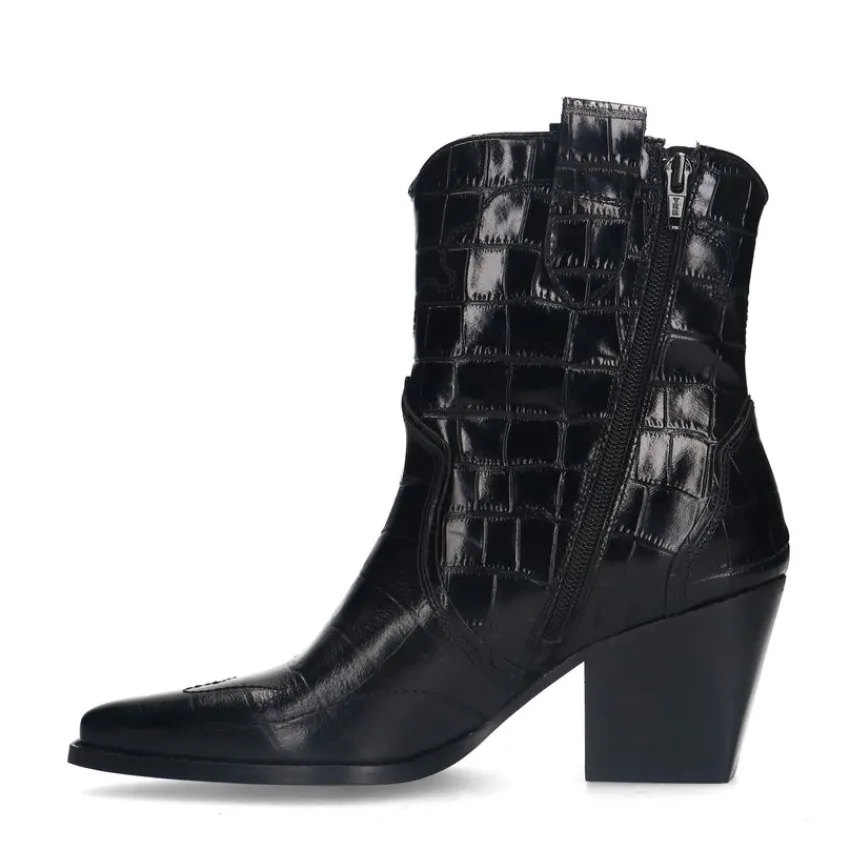 Zwarte leren croco cowboylaarzen van Manfield met schuin afgesneden blokhak van 7,5 cm en plateauhoogte van 1 cm. De laarzen hebben een puntige neus, we adviseren als verzorging en bescherming de Collonil Carbon Pro.