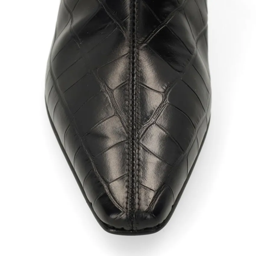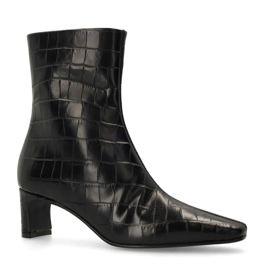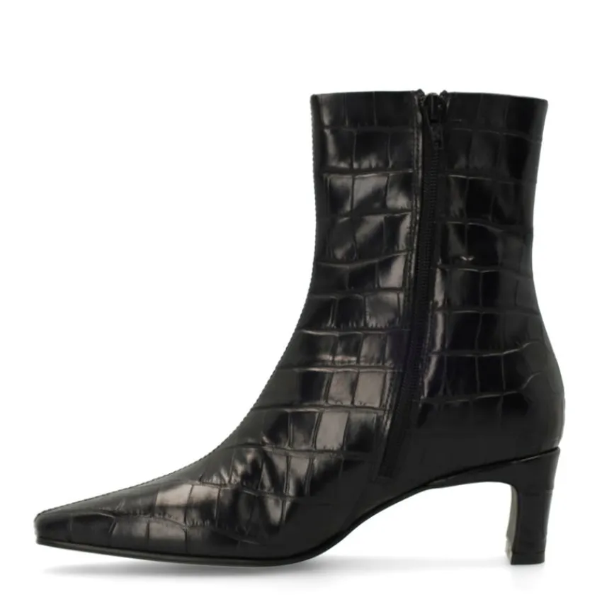 Zwarte leren croco enkellaarsjes met hak van Manfield. De enkellaarsjes hebben een lage hak van 5 cm, vierkante neus en een ritssluiting aan de binnenzijde. We adviseren als verzorging en bescherming de Collonil Carbon Pro.