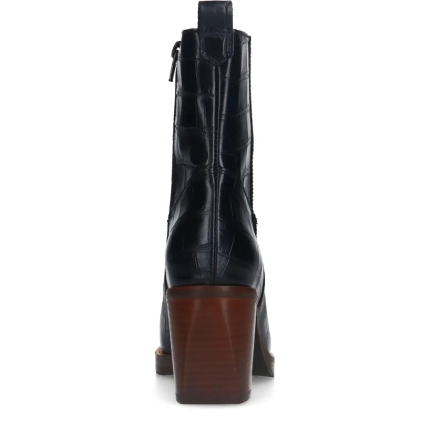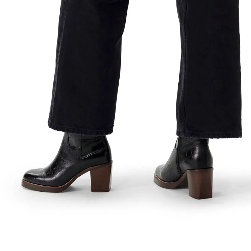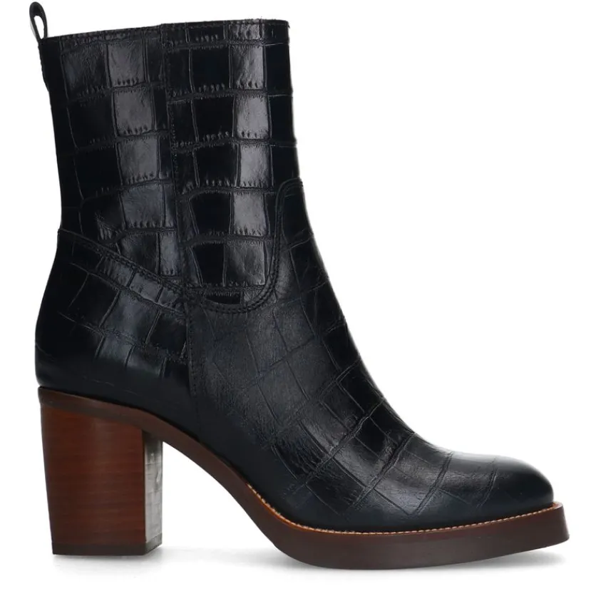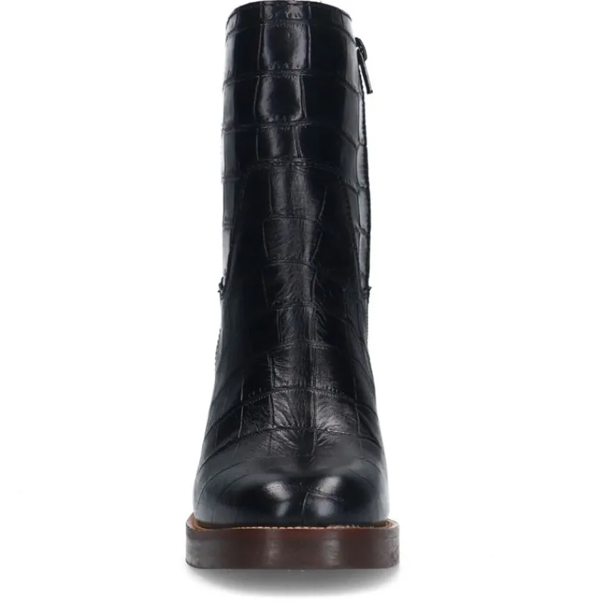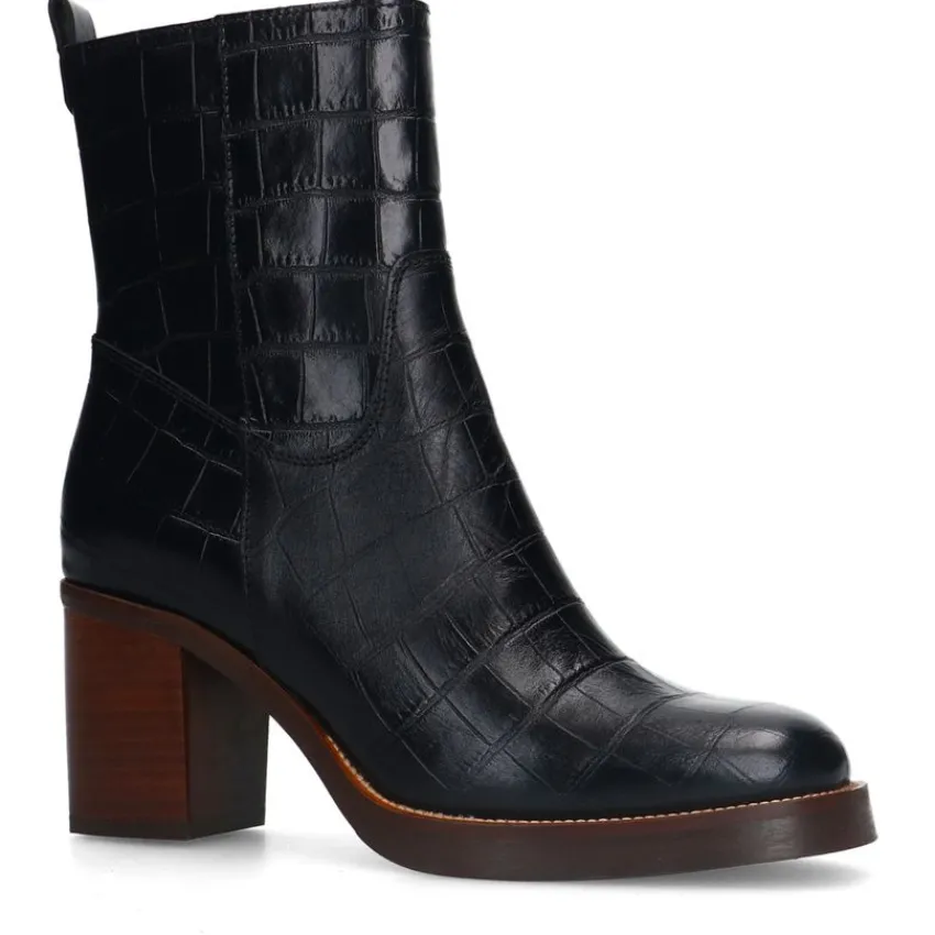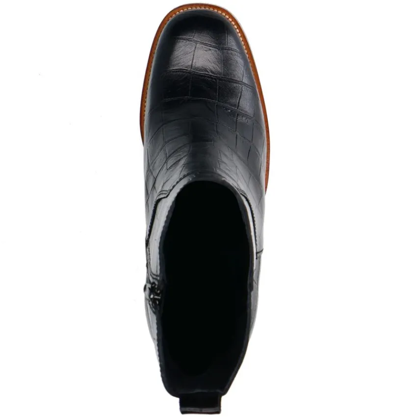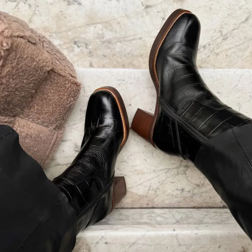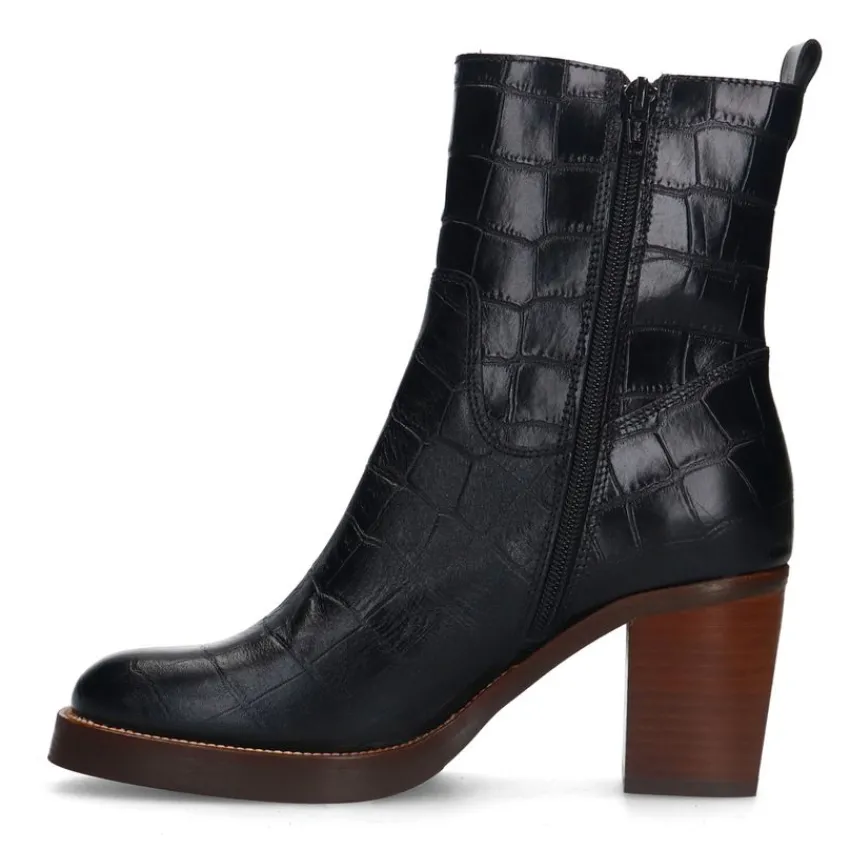 Zwarte leren croco enkellaarsjes met hak van Manfield. De laarsjes hebben een ritssluiting aan de binnenzijde, ronde neus en bruine blokhak van 8 cm. We adviseren als verzorging en bescherming de Collonil Carbon Pro.