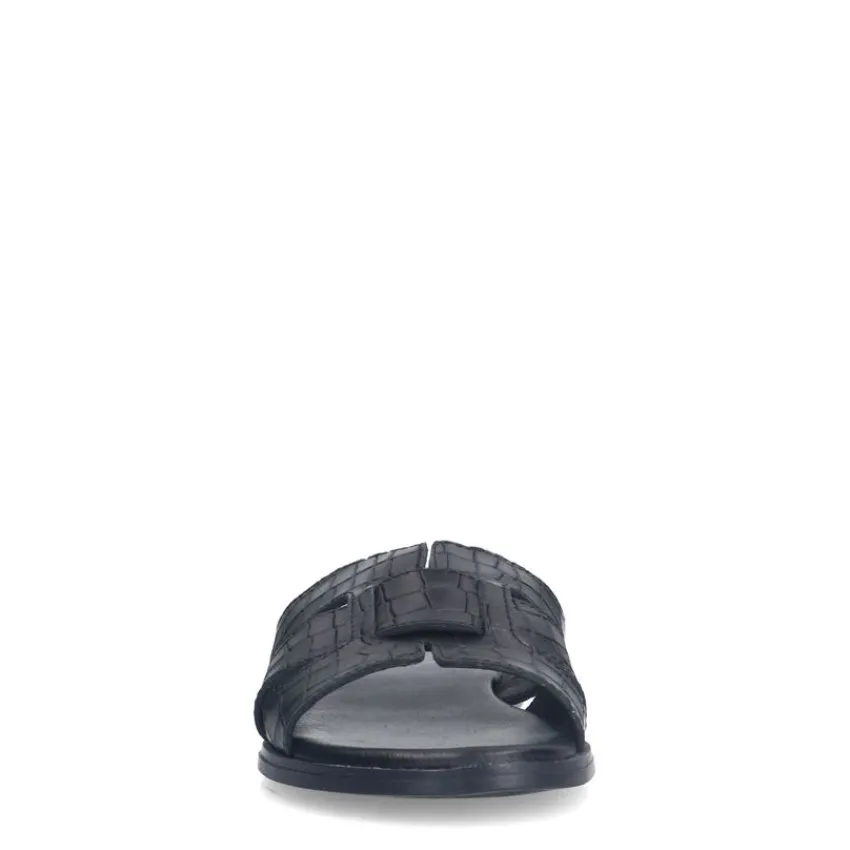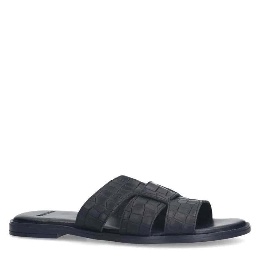 Zwarte leren croco slippers van Manfield, met platte hak van 1 cm en brede band op de voorvoet. We adviseren als verzorging en bescherming de Collonil Carbon Pro.