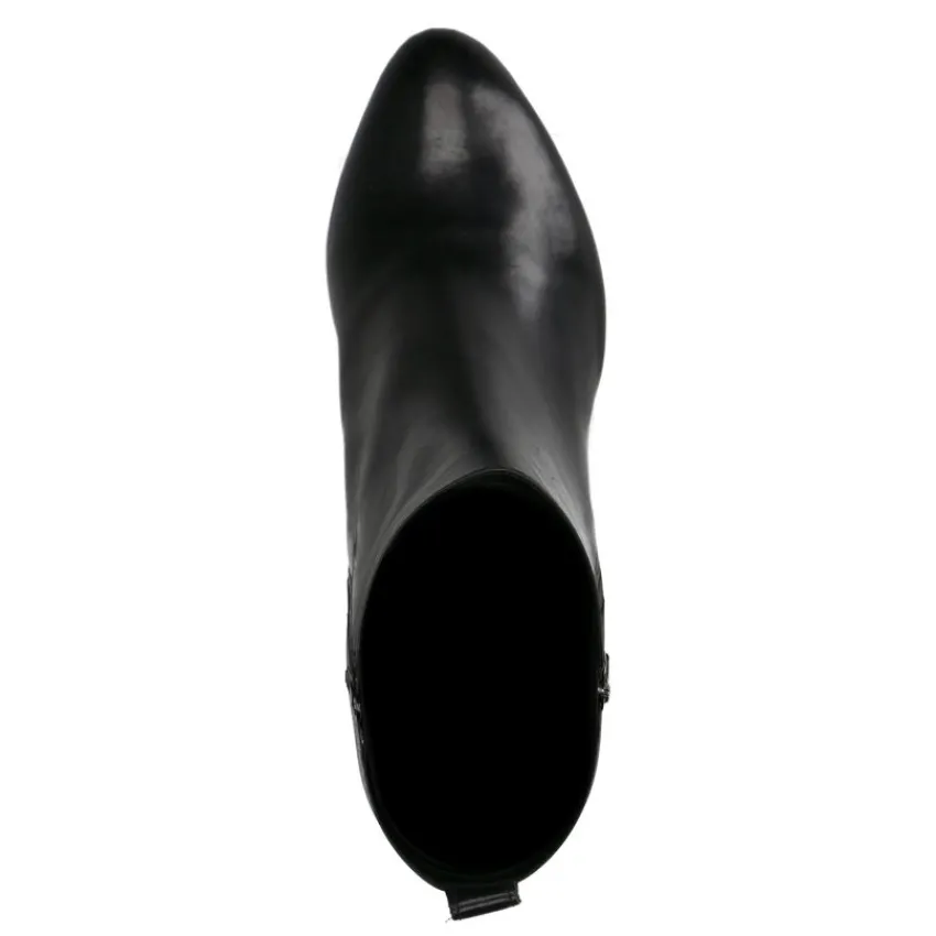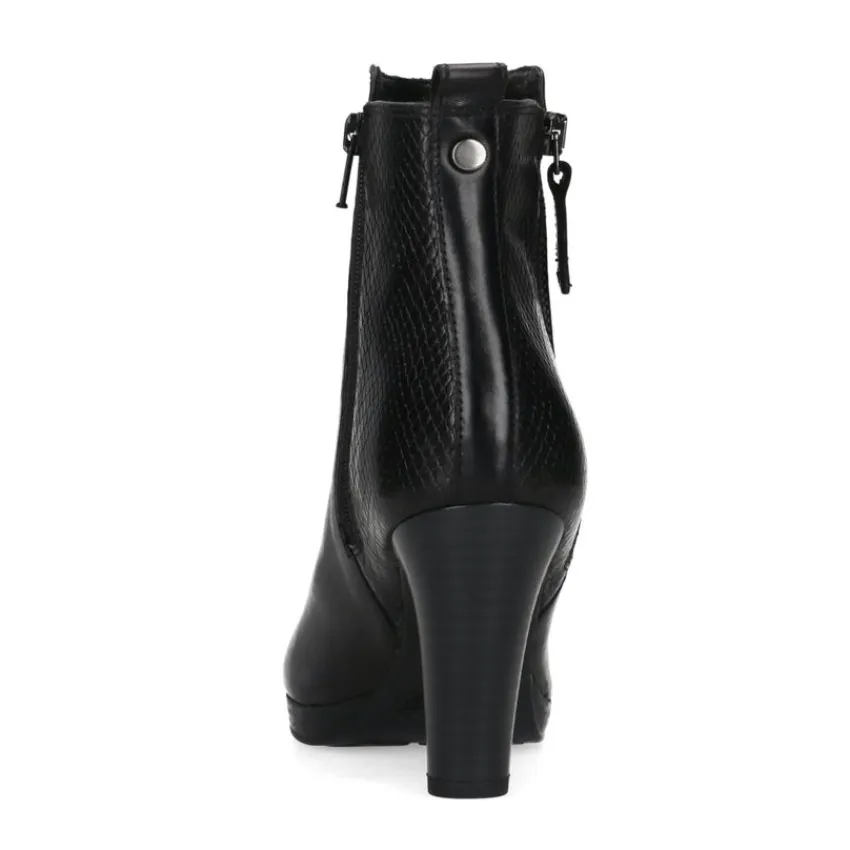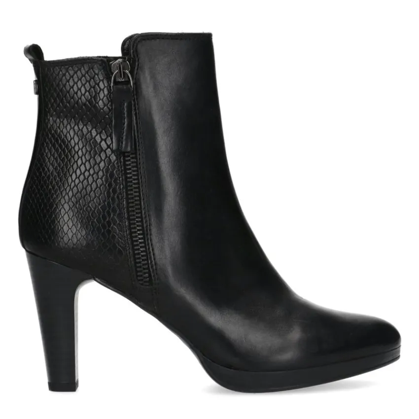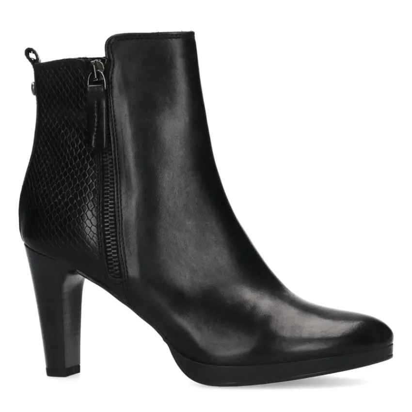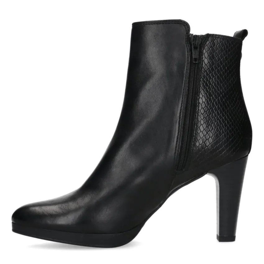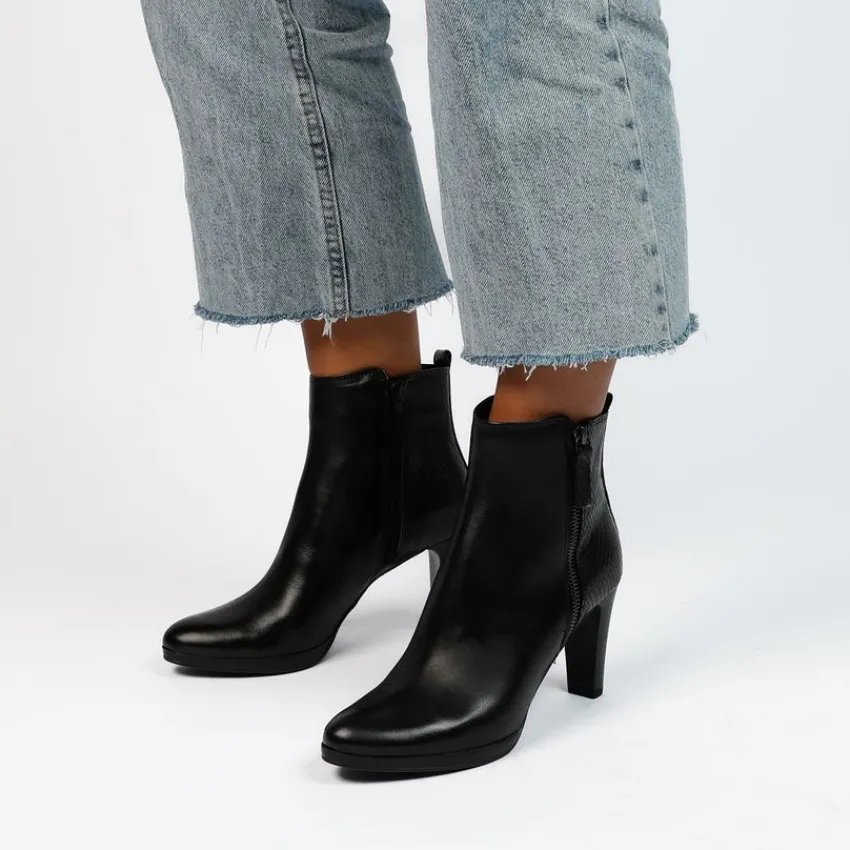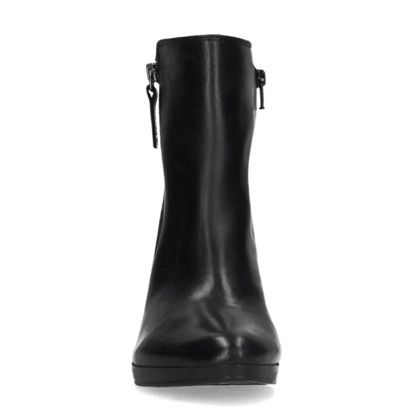 Zwarte enkellaarsjes met hak van Manfield. De laarsjes hebben een hak van 8,5 cm. We adviseren als verzorging en bescherming de Collonil Carbon Pro.