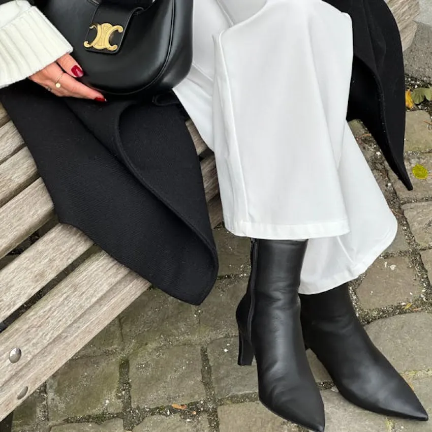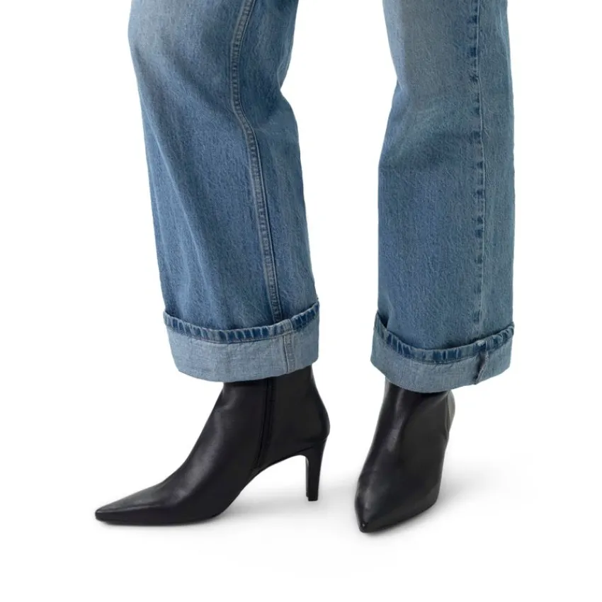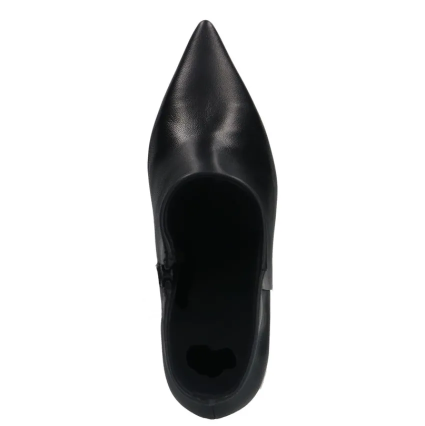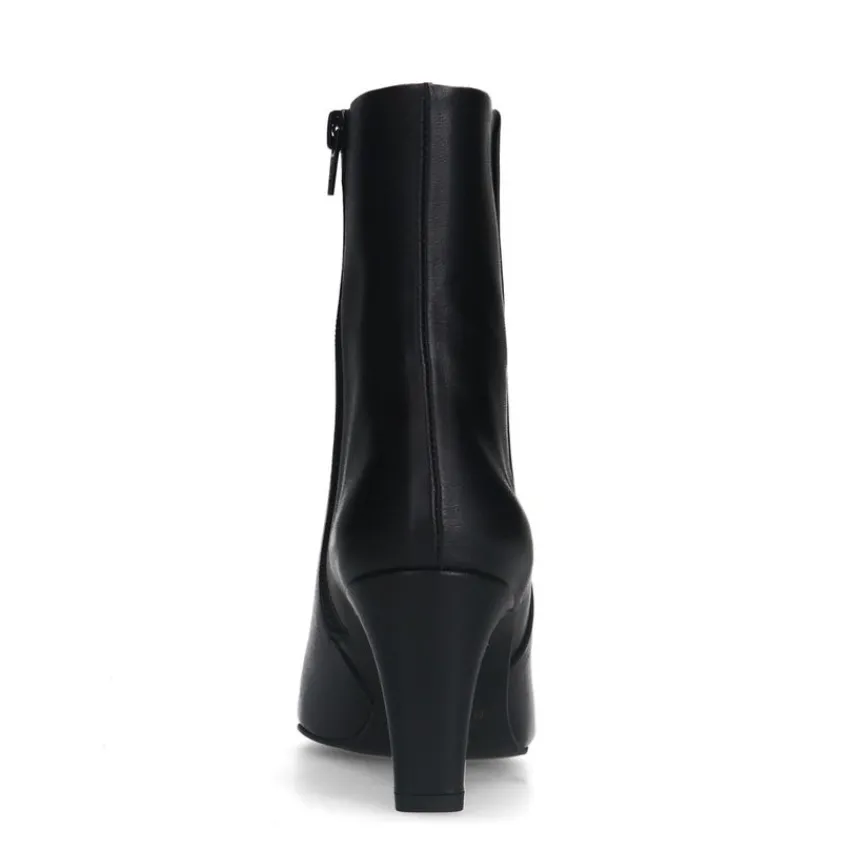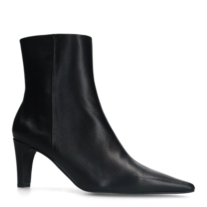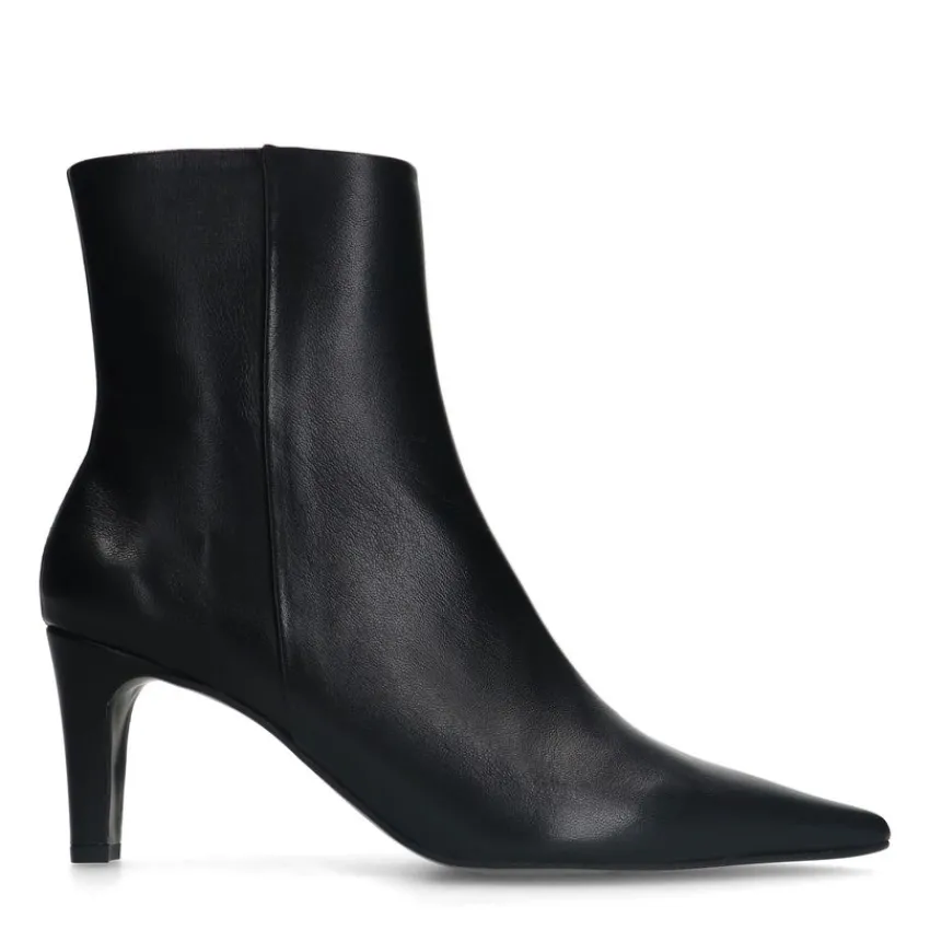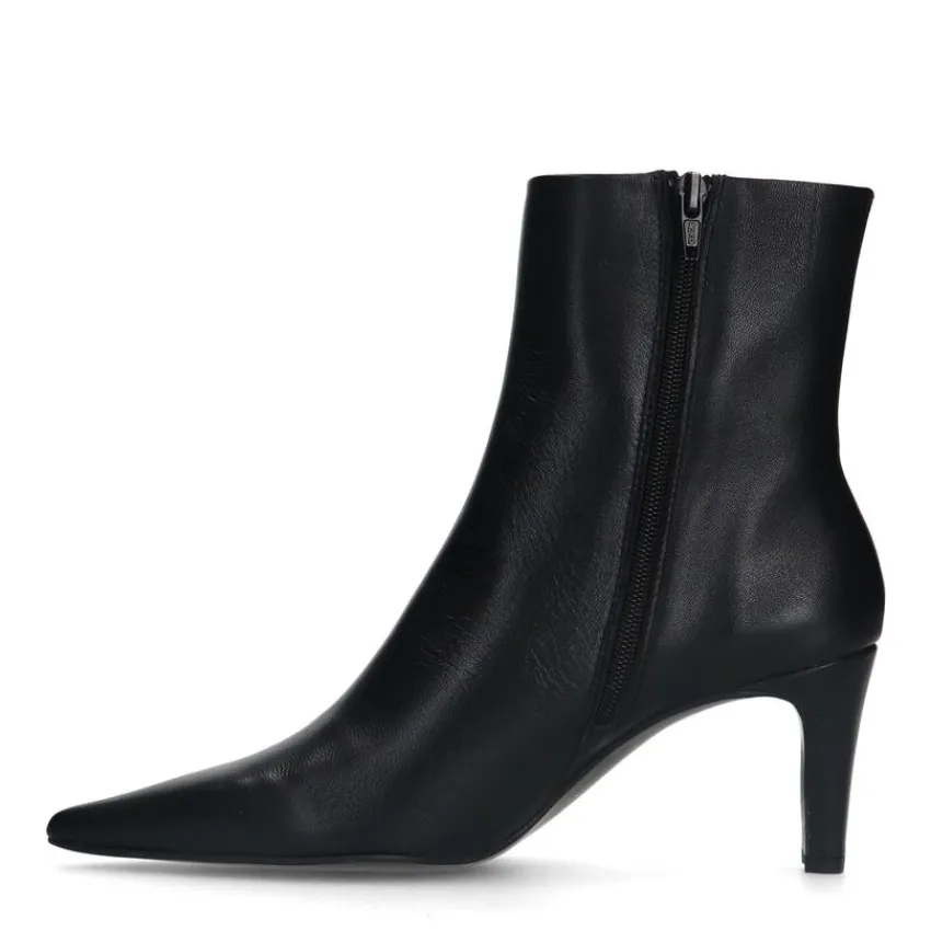 Zwarte leren enkellaarsjes met hak van Manfield. De laarsjes hebben een hak van 7 cm, ritssluiting aan de binnenzijde en goud detail aan de zijkant. De schachthoogte is 14 cm en de schachtbreedte 27 cm, gemeten bij een maat 37. We adviseren als verzorging en bescherming de Collonil Carbon Pro.
