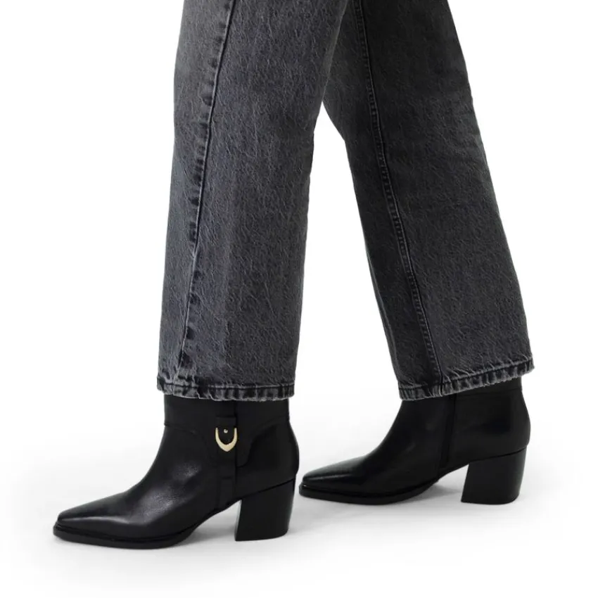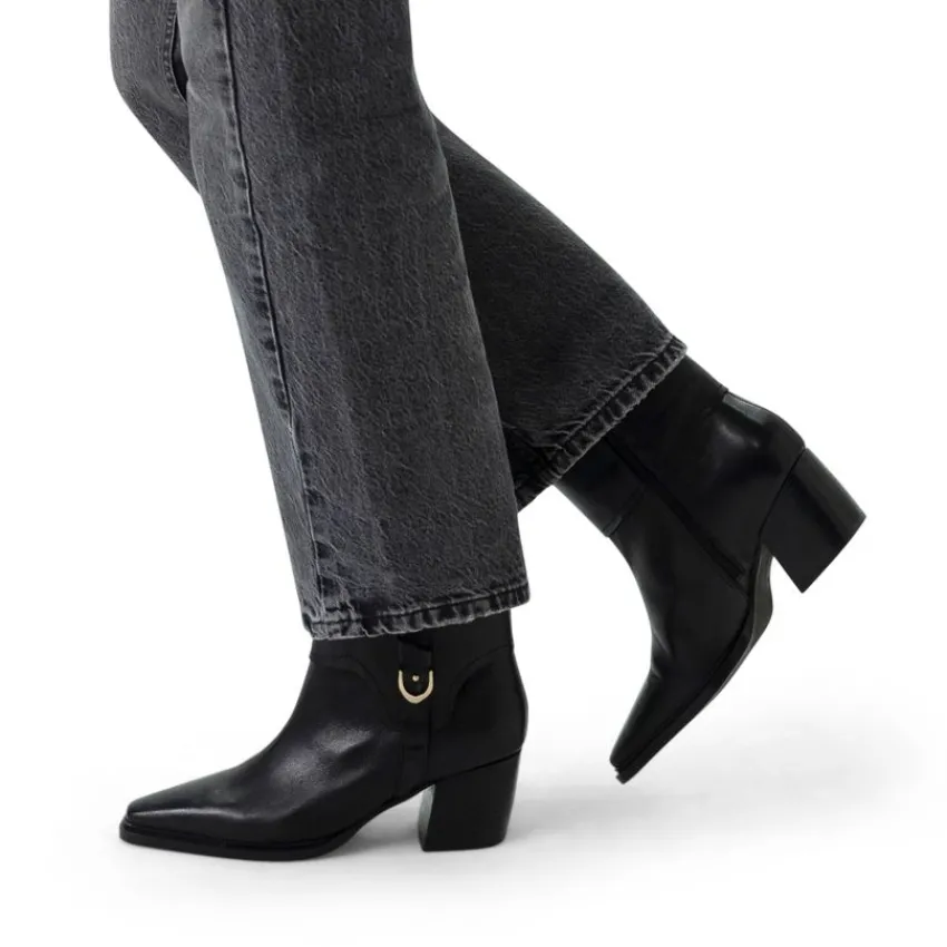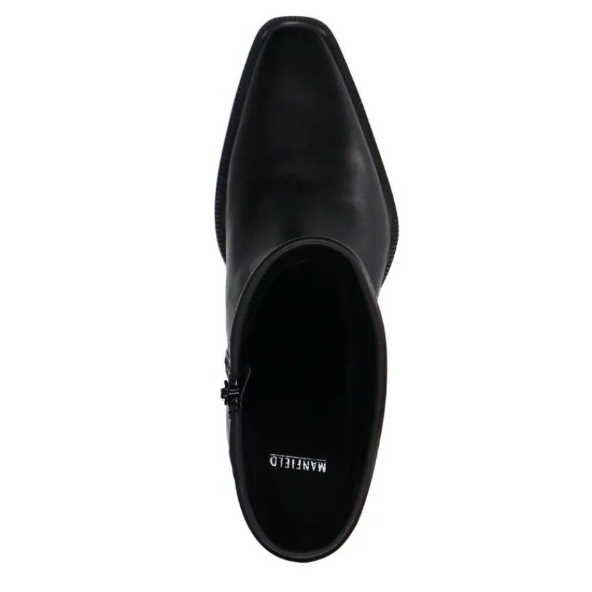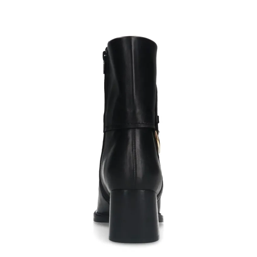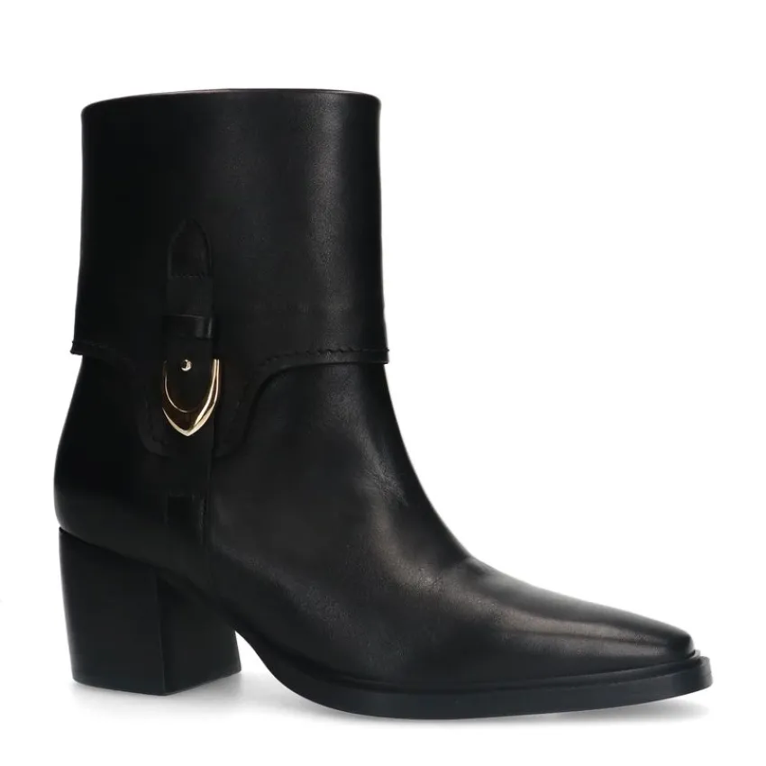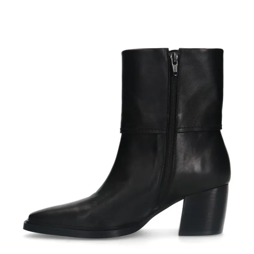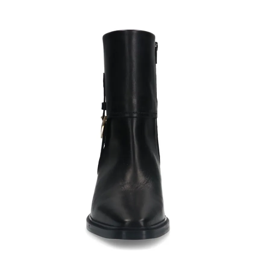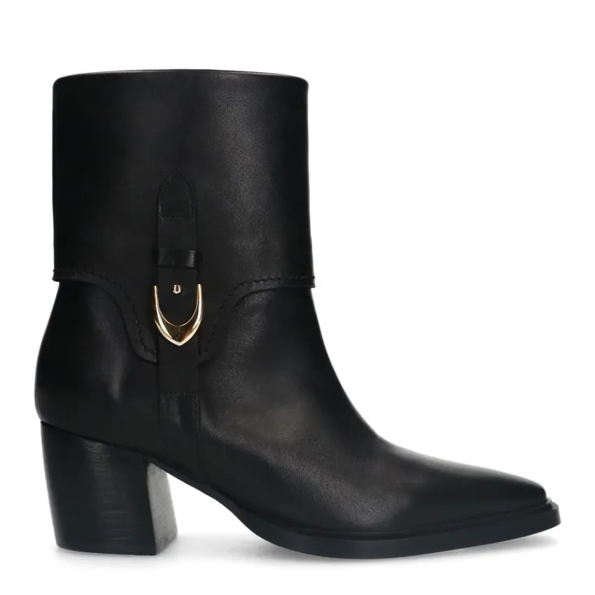Zwarte leren enkellaarsjes met hak van Manfield. De laarsjes hebben een blokhak van 6 cm, ritssluiting aan de binnenzijde en goud detail aan de zijkant. De schachthoogte is 17 cm en de schachtbreedte 31 cm, gemeten bij een maat 37. We adviseren als verzorging en bescherming de Collonil Carbon Pro.