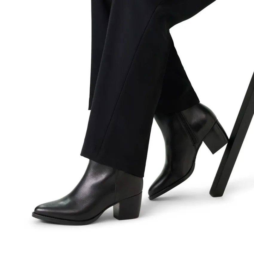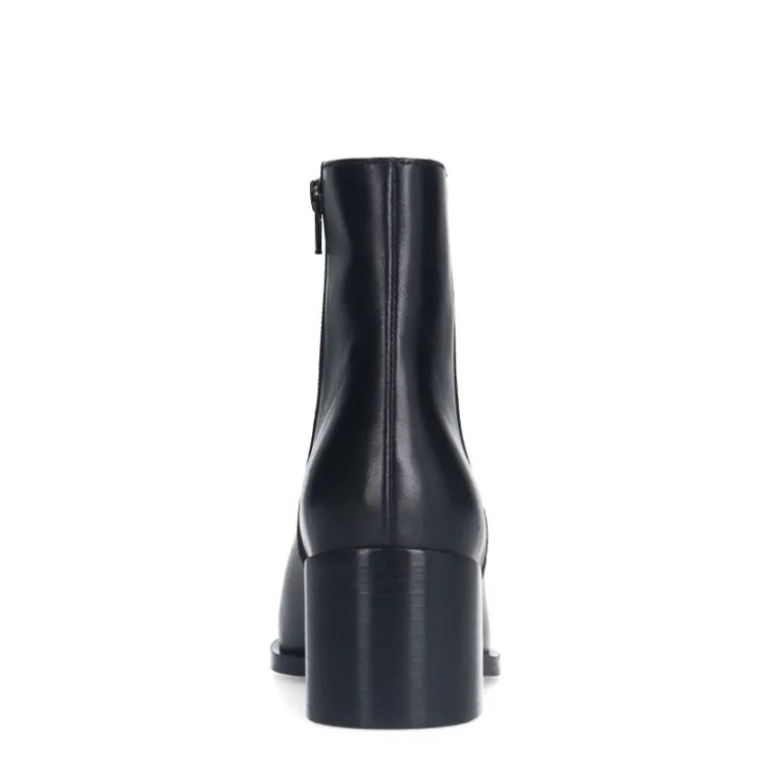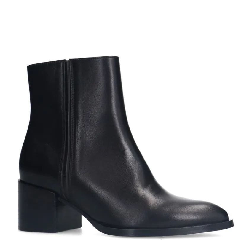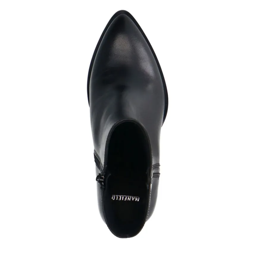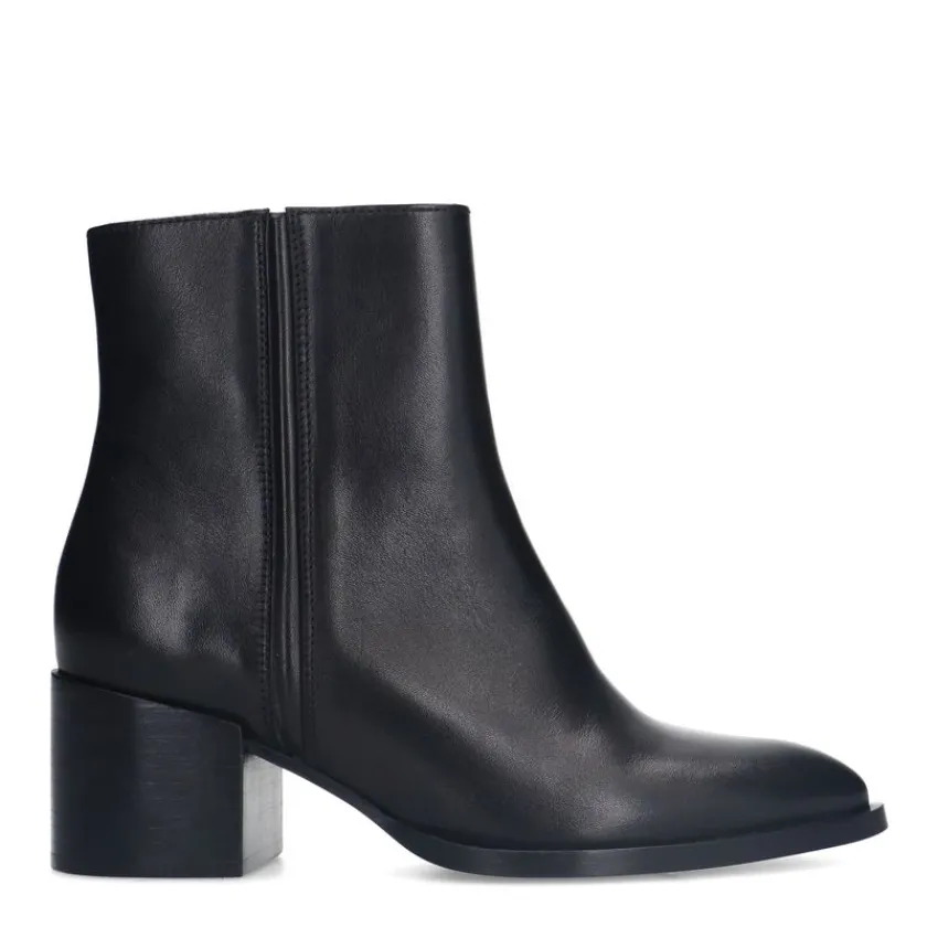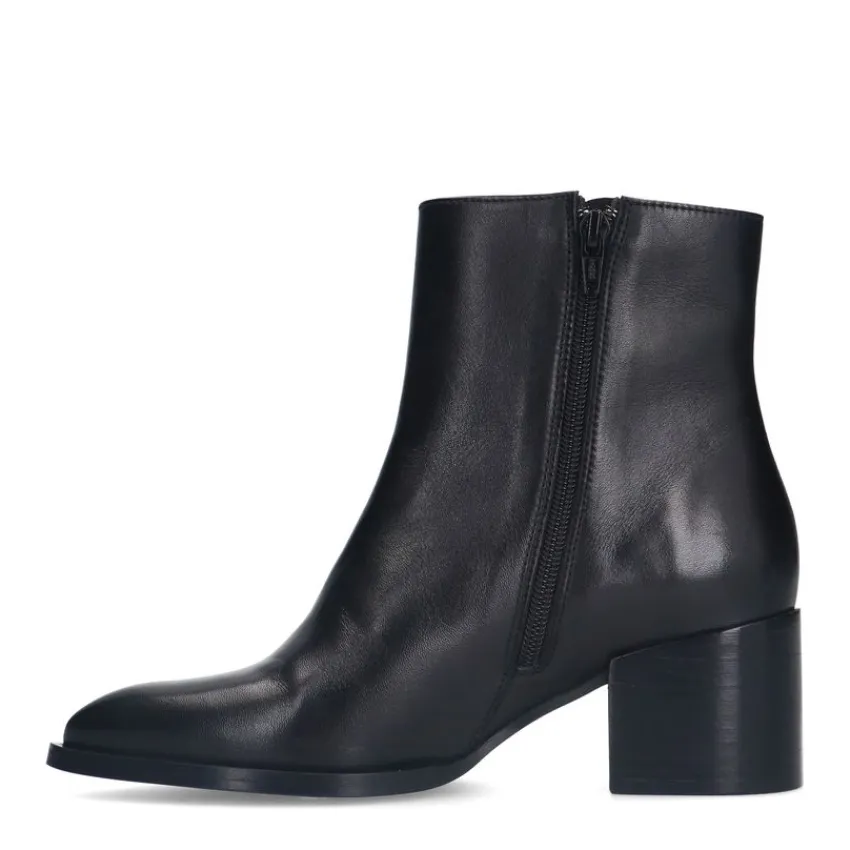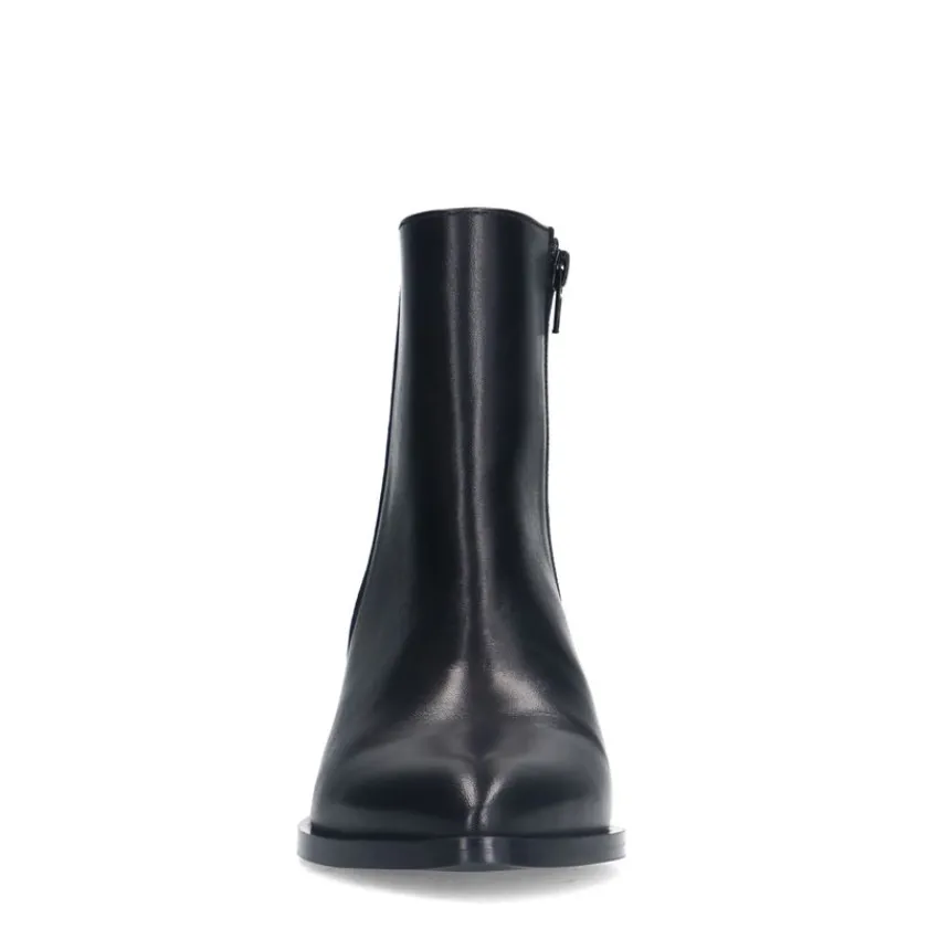 Zwarte leren enkellaarsjes van Manfield. De laarsjes hebben een blokhak van 6 cm en een ritssluiting aan de binnenzijde. We adviseren als verzorging en bescherming de Collonil Carbon Pro.