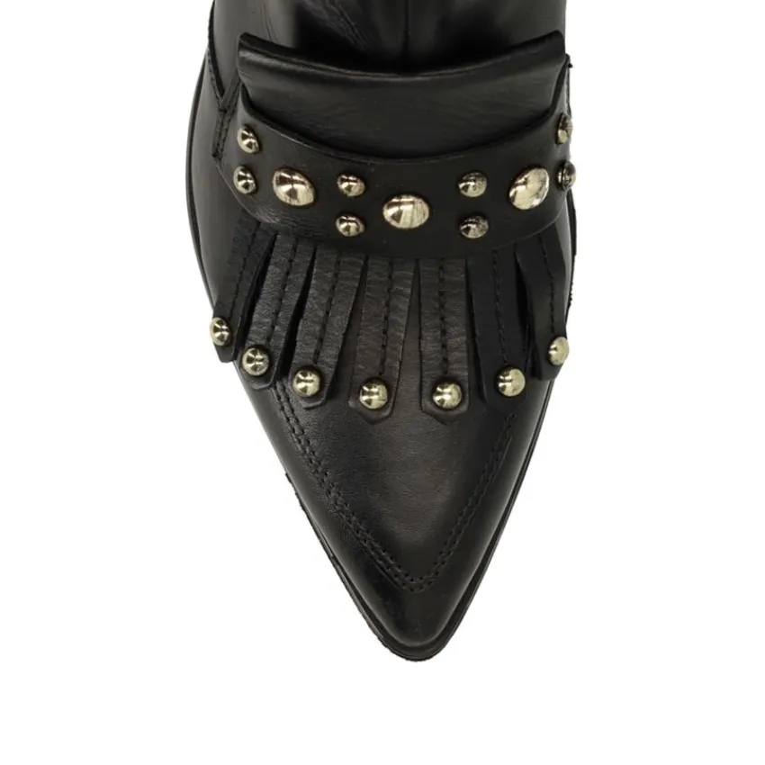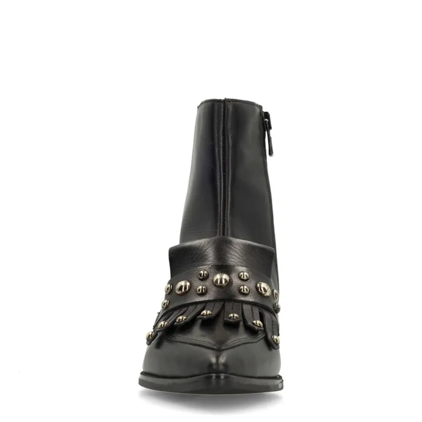 Zwarte leren enkellaarsjes met studs details op de voorvoet van Manfield. De enkellaarsjes hebben een puntneus, ritssluiting aan de binnenzijde en platte hak van 2 cm. We adviseren als verzorging en bescherming de Collonil Carbon Pro.
