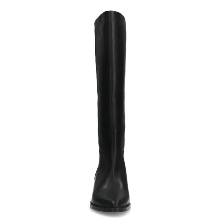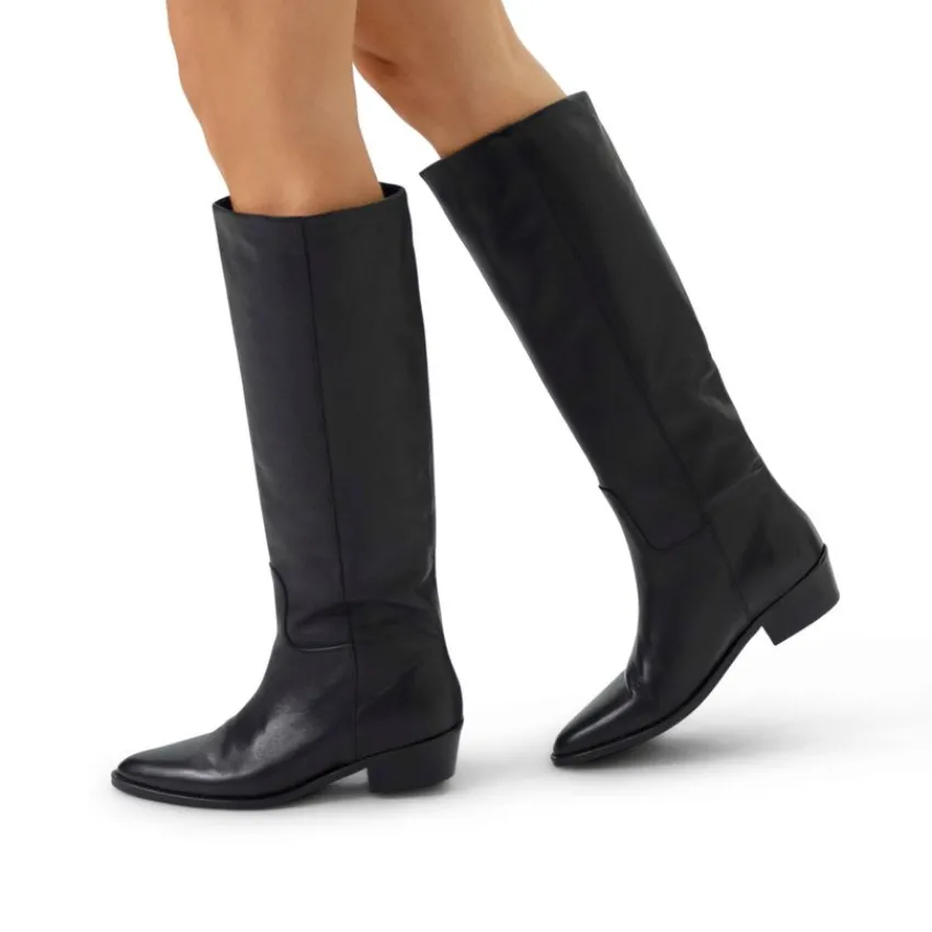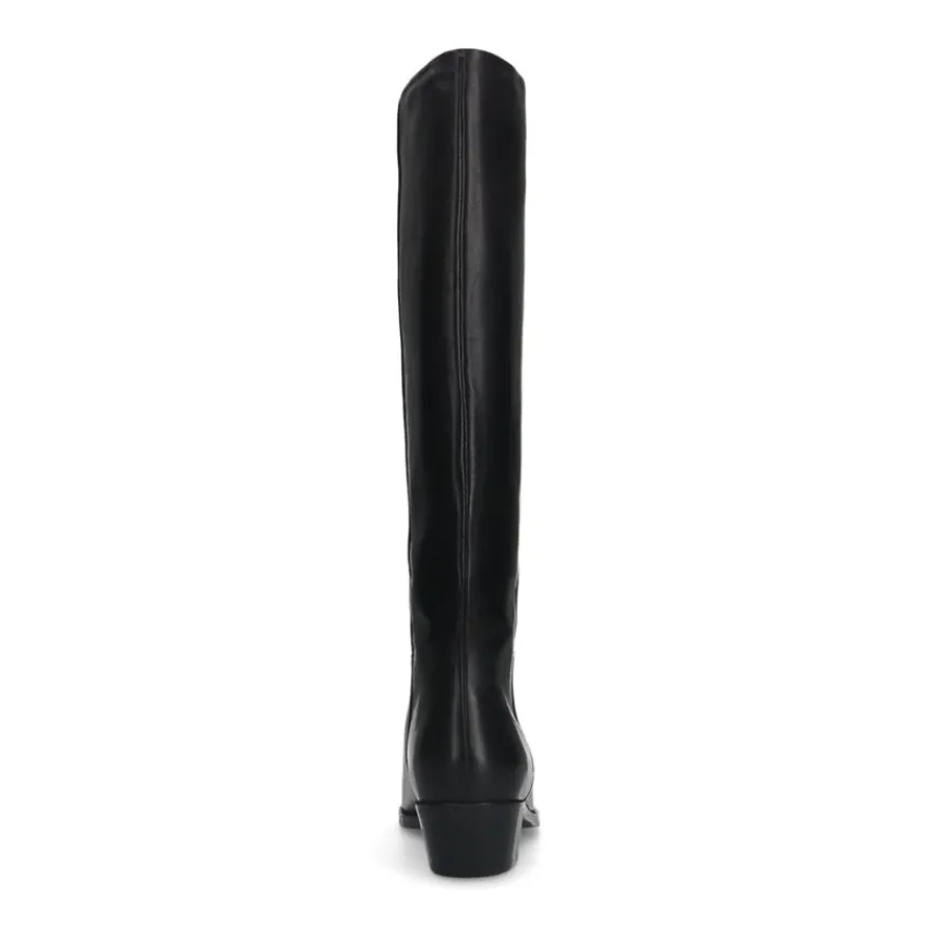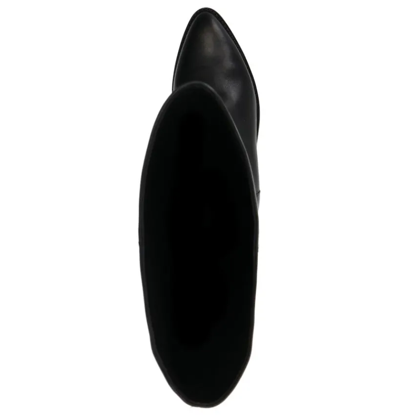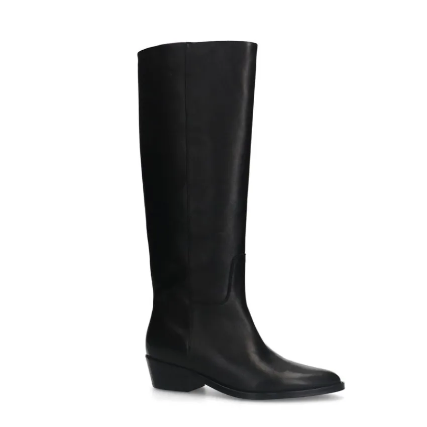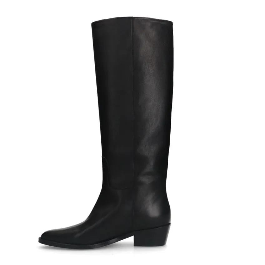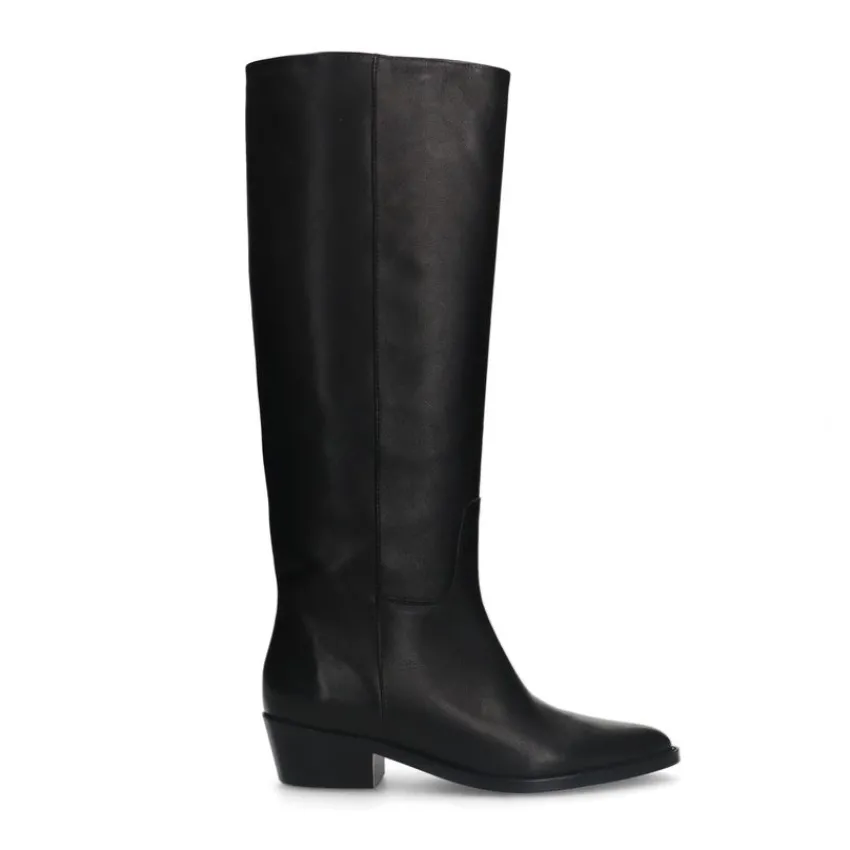 Zwarte leren hoge laarzen van Manfield met platte hak van 4 cm en puntige neus. De laarzen hebben een schachthoogte van 41 cm en een schachtbreedte van 36 cm, gemeten bij een maat 37. We adviseren als verzorging en bescherming de Collonil Carbon Pro.