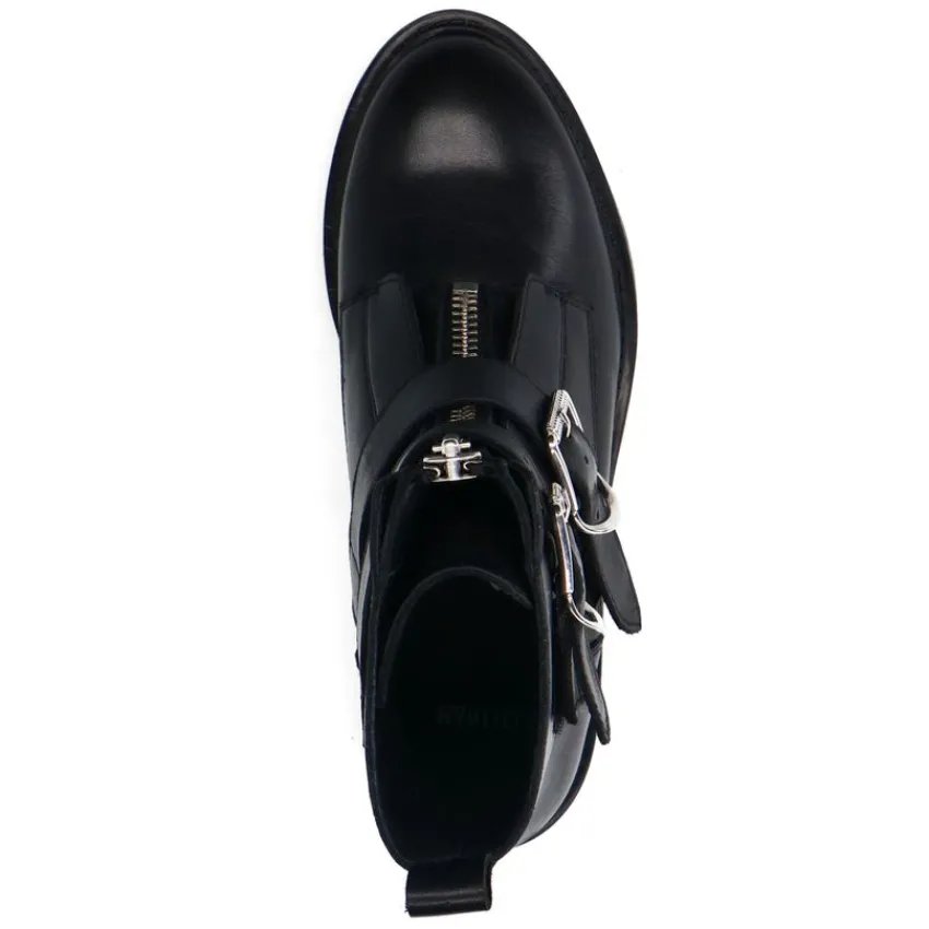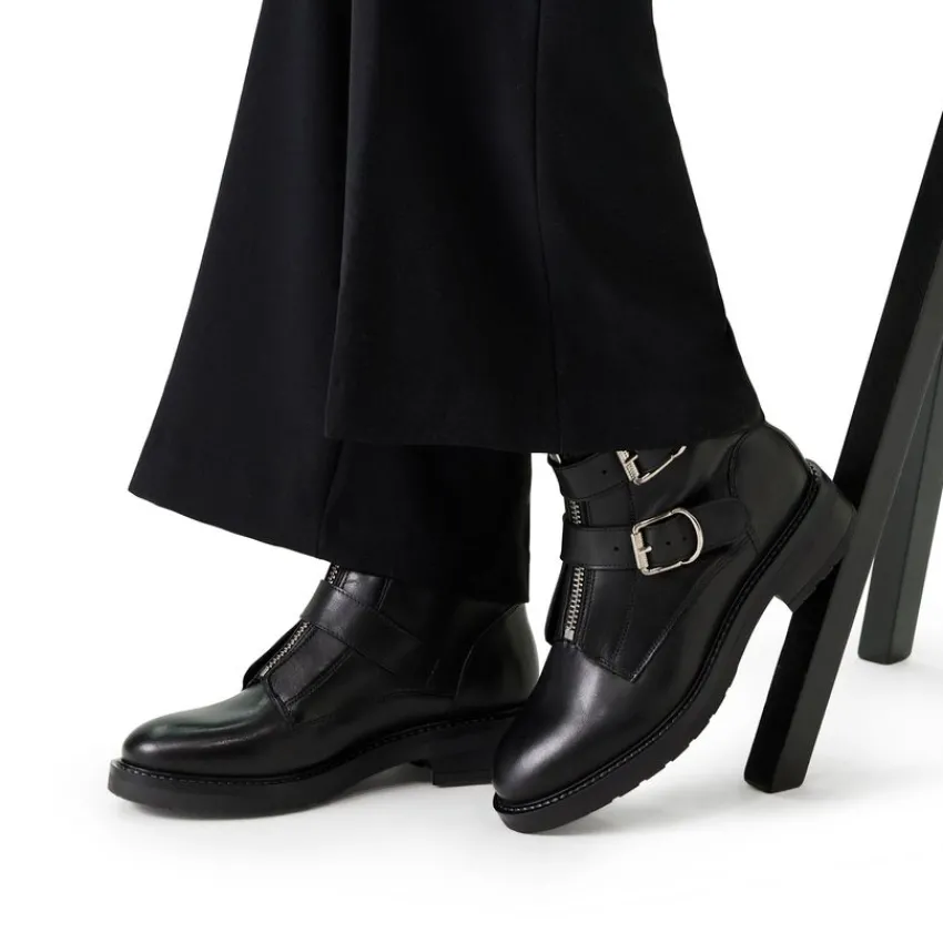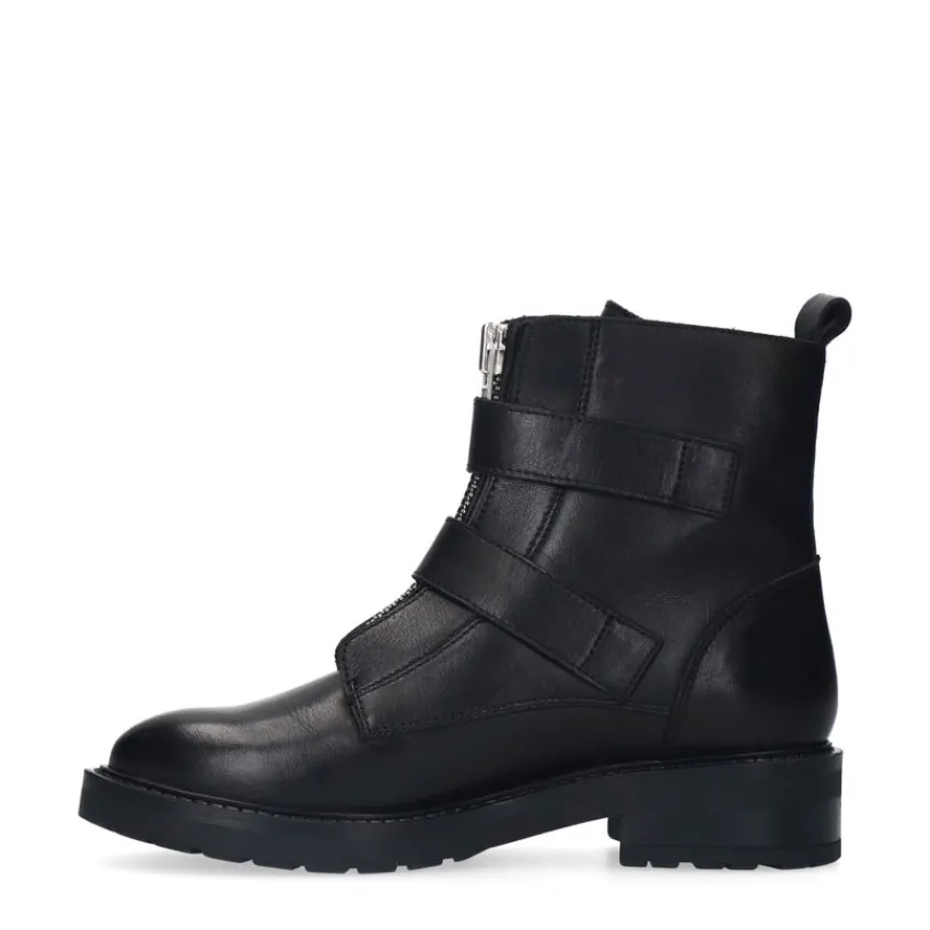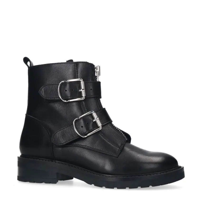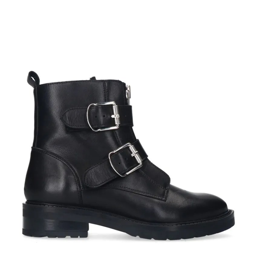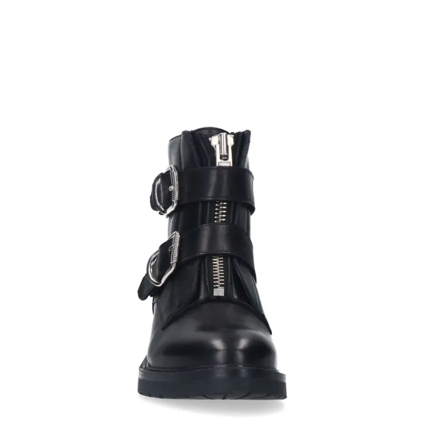 Zwarte leren laarsjes met gesp van Manfield. De laarsjes hebben een hak van 3 cm en ritssluiting aan de binnenzijde. We adviseren als verzorging en bescherming de Collonil Carbon Pro.