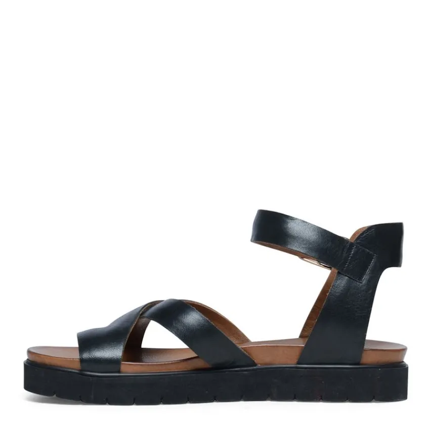 Zwarte leren plateau sandalen met gespsluiting van Manfield. De sandalen hebben een plateau van 2 cm, we adviseren als verzorging en bescherming de Collonil Carbon Pro.