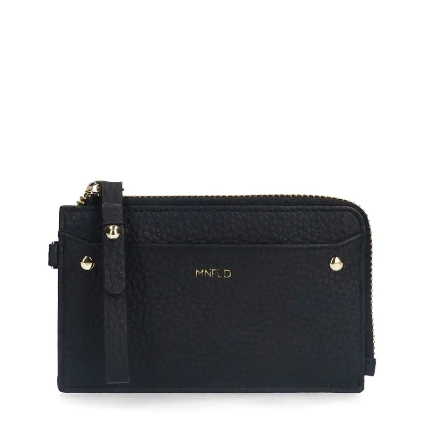 Zwarte leren portemonnee van Manfield met ritssluiting en vakjes voor passen. De afmeting van de portemonnee 13,5×8 cm (BxH).