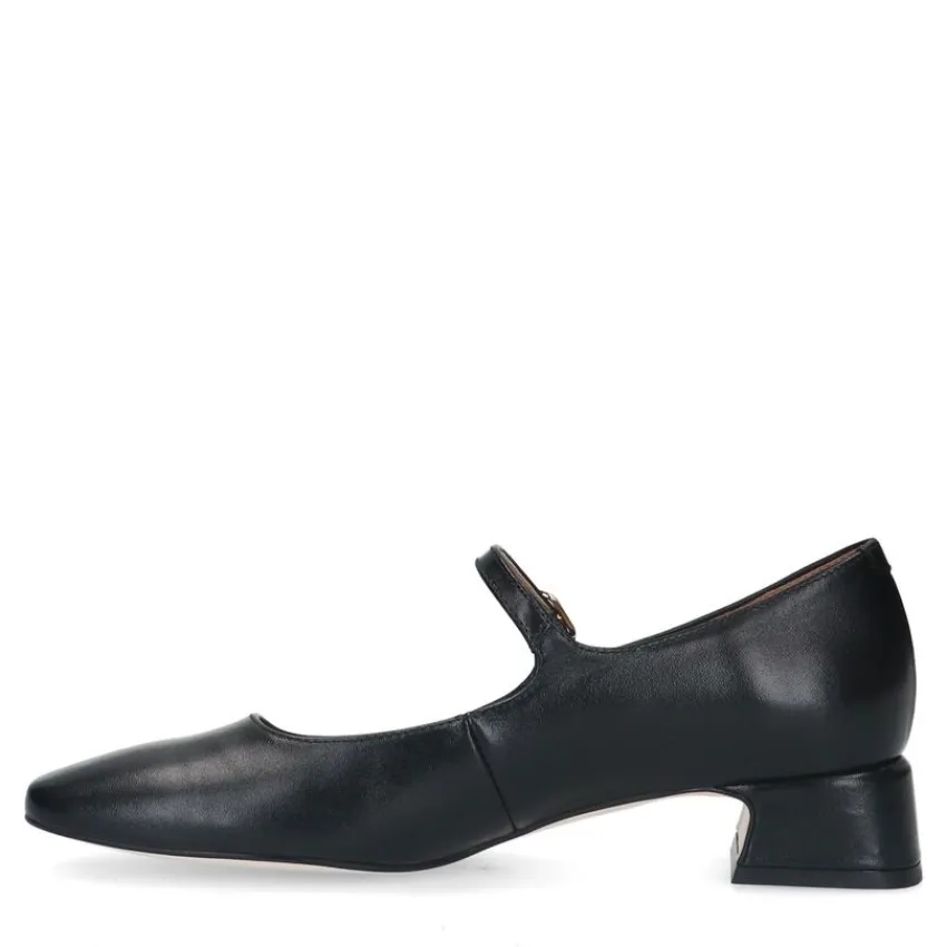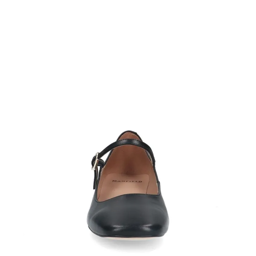 Zwarte leren pumps van Manfield. Deze schattige pumps zijn voorzien van een leren bandje over de upper en hebben een lage blokhak met hoogte van 4 cm. De neus is gevormd als carré en de pumps zijn gemaakt van leer. We raden je aan deze dames pumps te verzorgen en beschermen met de Collonil Carbon Pro.
