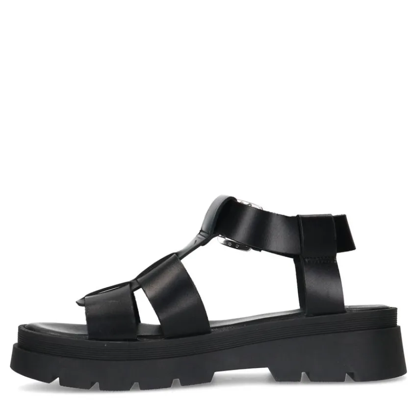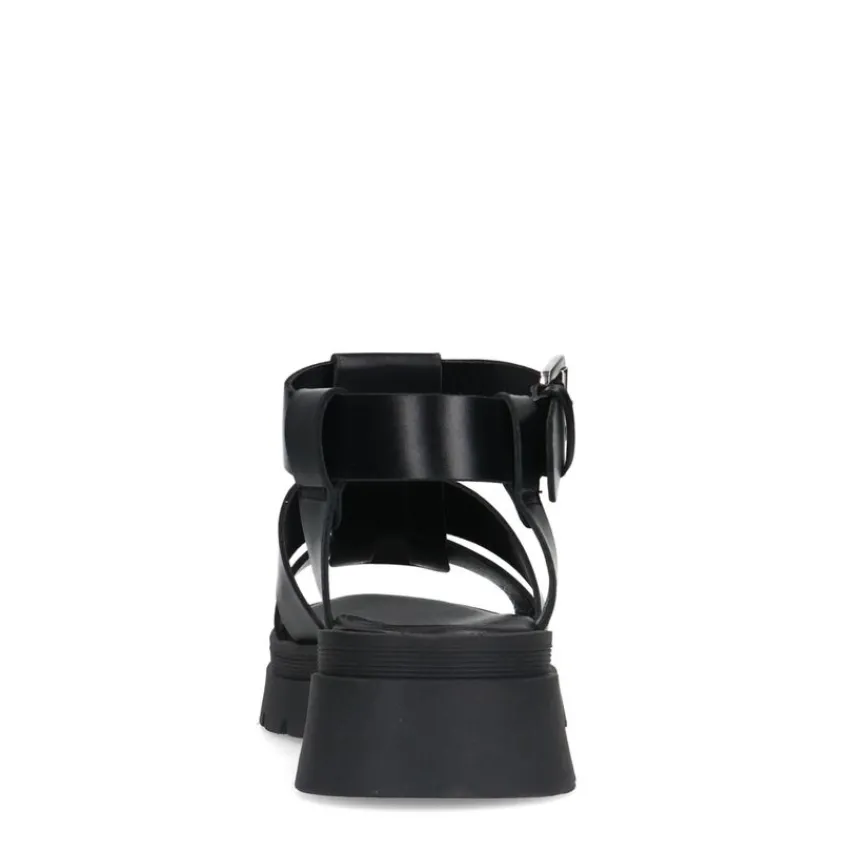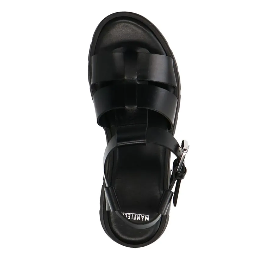 Zwarte leren sandalen van Manfield met chunky zool van 3 cm en gespsluiting rondom de enkels. We adviseren als verzorging en bescherming de Collonil Carbon Pro.