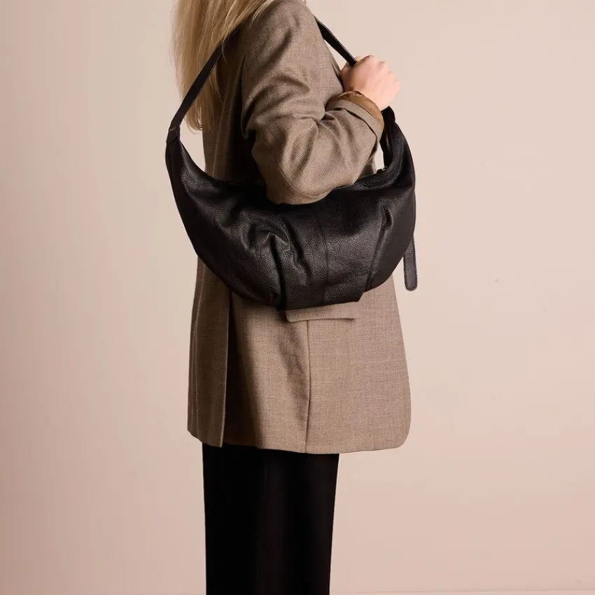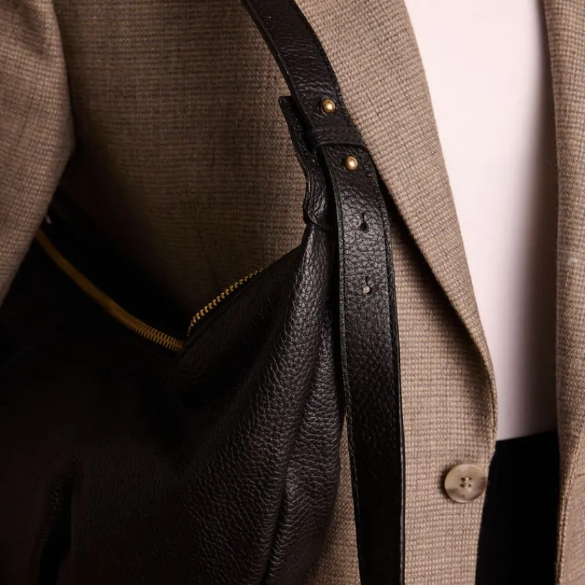Zwarte leren schoudertas van Manfield met verstelbare schouderband. De afmeting van deze tas is 46x21x13 cm (BxHxD), voorzien van een ritssluiting.