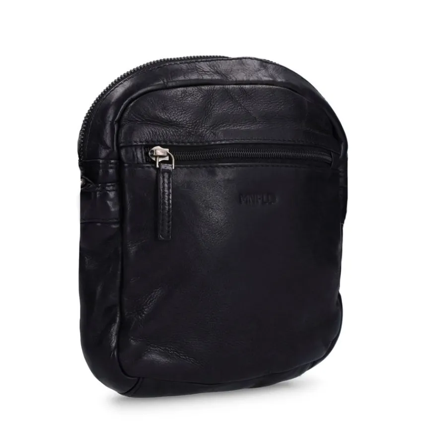 Zwarte leren schoudertas van Manfield met verstelbare band van 115 cm en ritssluiting. De tas heeft een afmeting van 24x21x7 cm, (LxBxH).