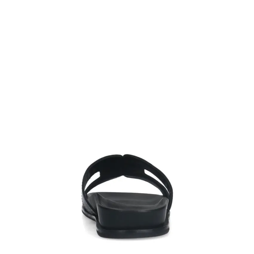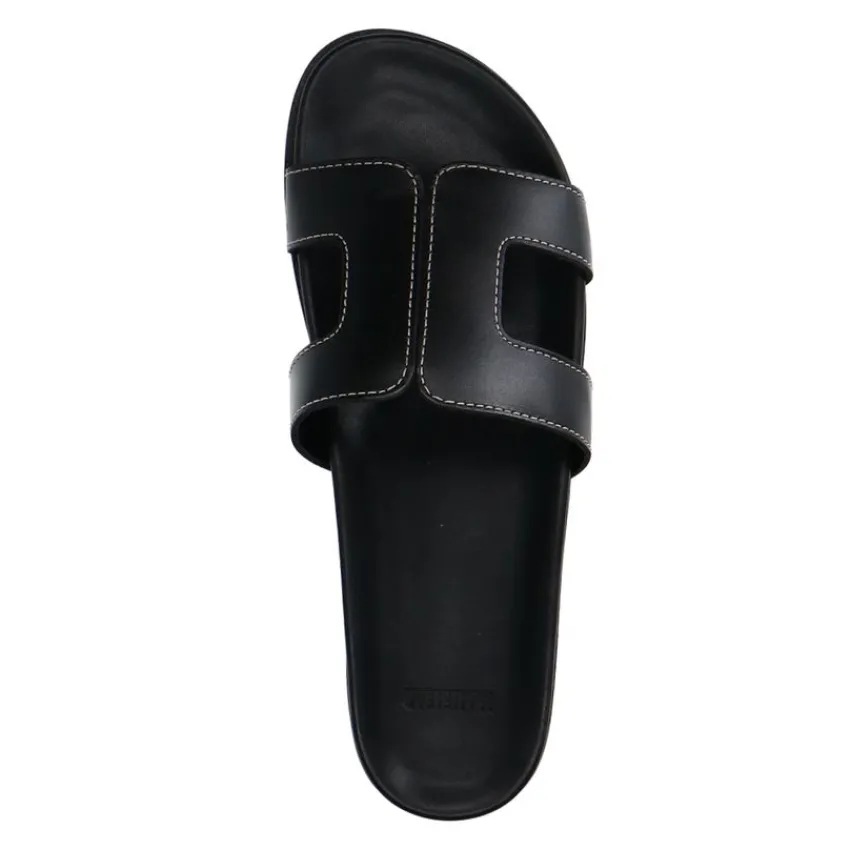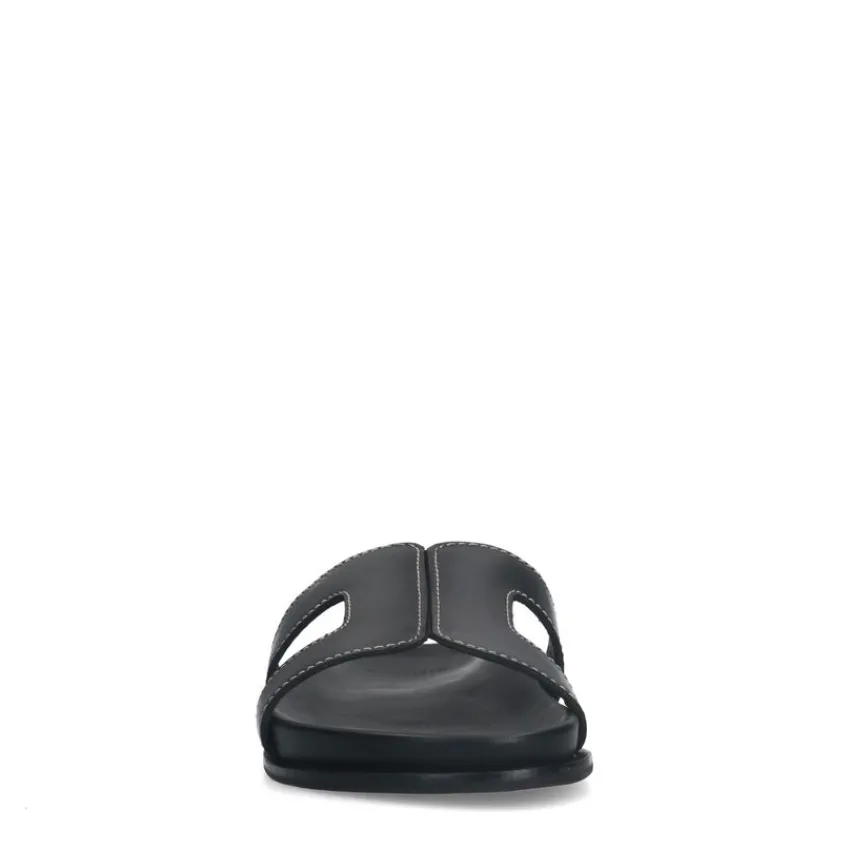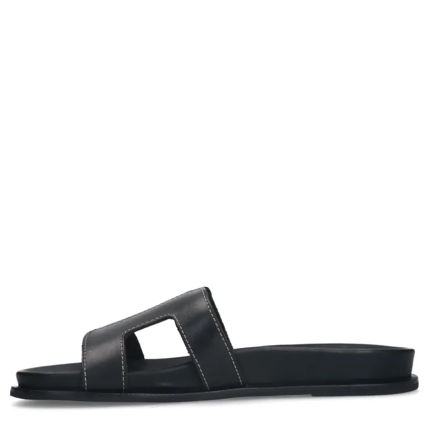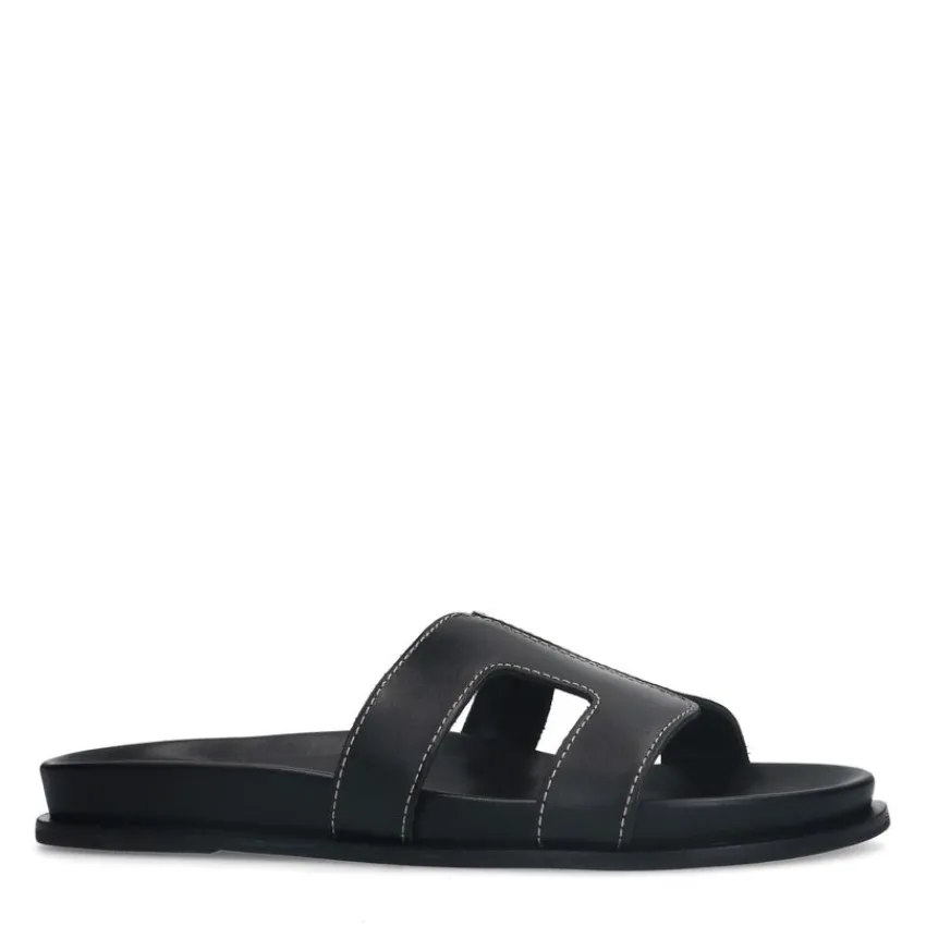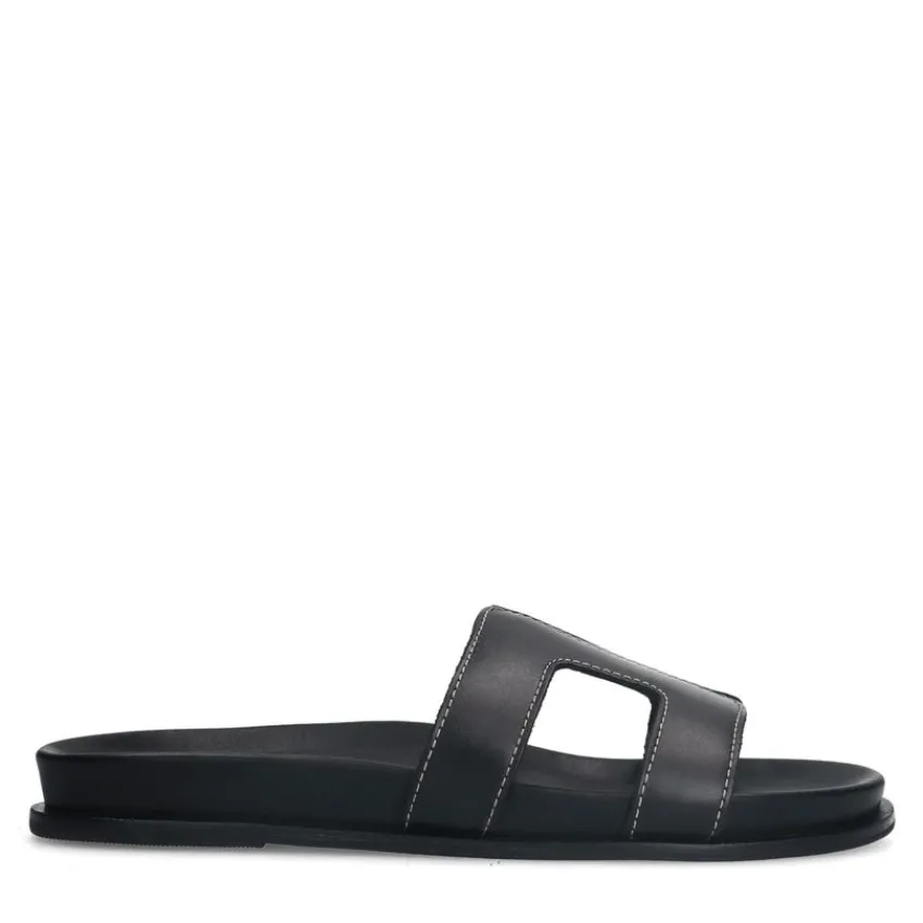 Zwarte leren slippers van Manfield met een brede band over de voorvoet en plateauzool van 2 cm. We adviseren deze slippers te verzorgen met de Collonil Carbon Pro.