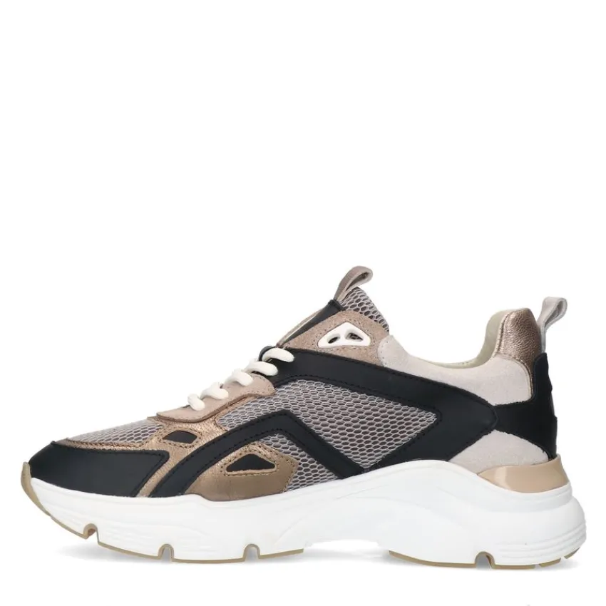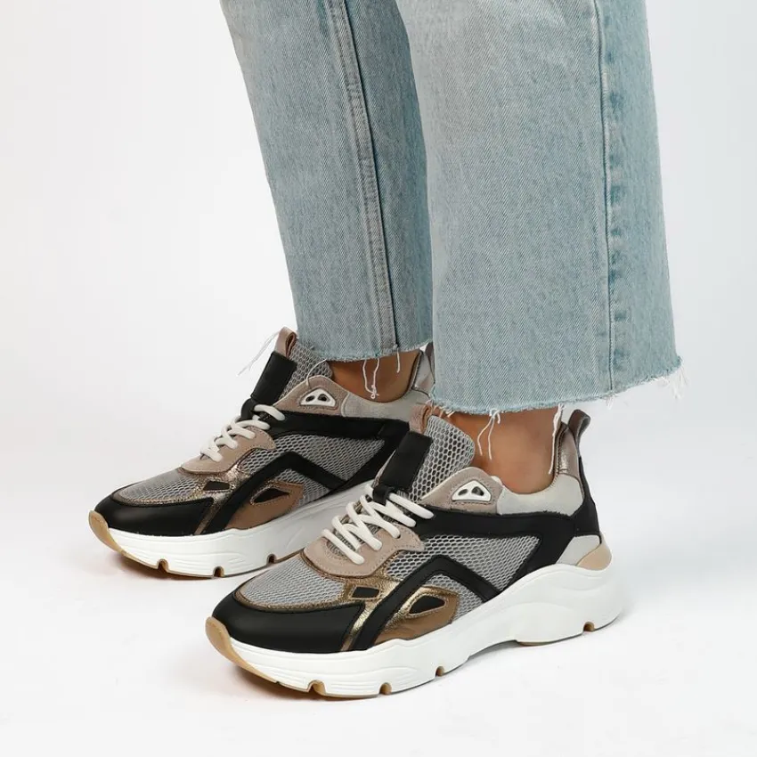 Zwarte leren sneakers met mesh details van Manfield. Deze dames sneakers zijn gemaakt van leer en daarom raden we je aan deze sneakers voor dames te verzorgen en beschermen met de Collonil Carbon Pro. Deze sneakers zijn voorzien van een platform chunky zool met hoogte van 2 cm en de sneaker is voorzien van metallic én suède details. De mesh details over de sneakers zorgt voor een casual en sportieve uitstraling.