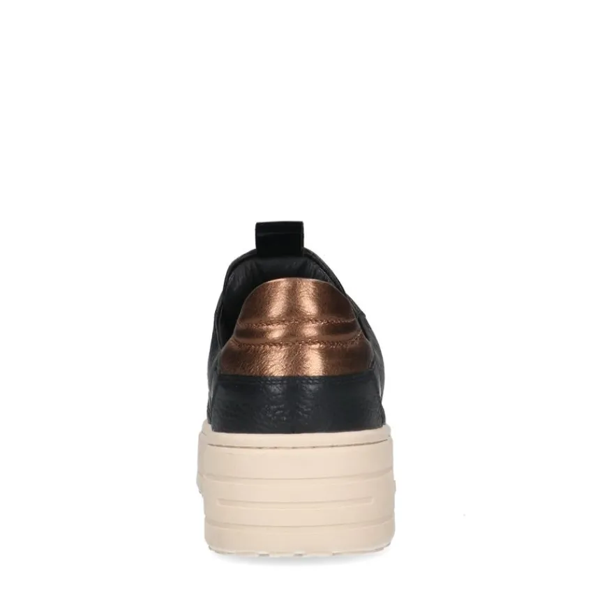 Zwarte leren sneakers van Manfield. Deze sportieve sneakers zijn gemaakt van leer en daarom raden we je aan deze sneakers te verzorgen en beschermen met de Collonil Carbon Pro. Deze sneakers zijn voorzien van een beige zool, wat zorgt voor een casual en sportieve uitstraling. De bronzen metallic uitstraling zorgt voor nét dat beetje extra.